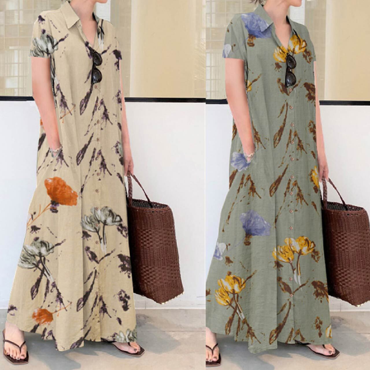 シャツワンピース レディース ワンピース ロング マキシ フルレングス 半袖 襟付き Aライン ゆったり 前開き コットン ポリエステル シンプル こなれ感 ラフ ナチュラル 無地 花柄 フラワー 春 夏 マタニティ デート お出かけ お泊まり リゾート 旅行 海 プール ビーチ 公園 アースカラー コーデ 楽ちん 体型カバー 脚長 ブラック ベージュ カーキ ネイビー ベーシックカラー