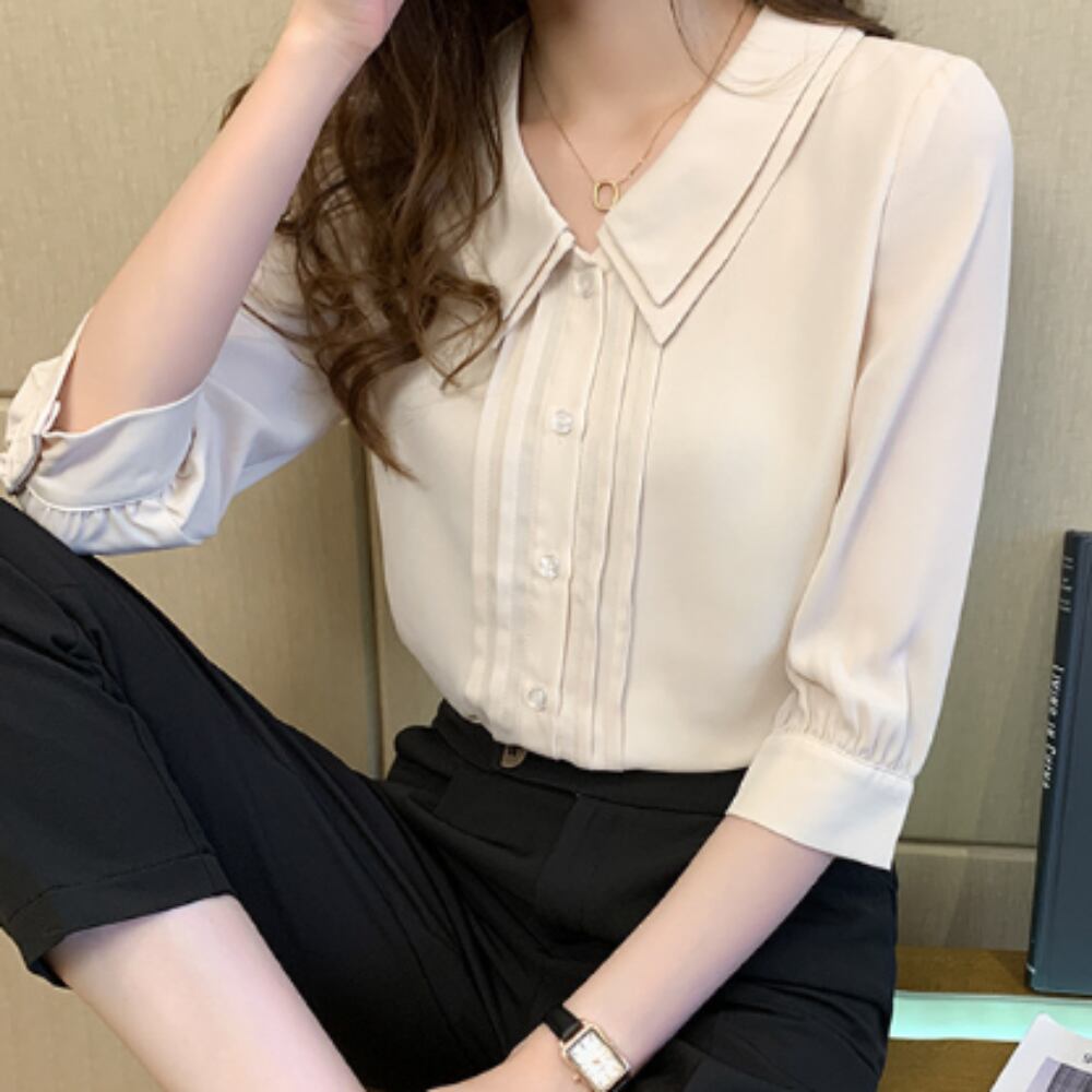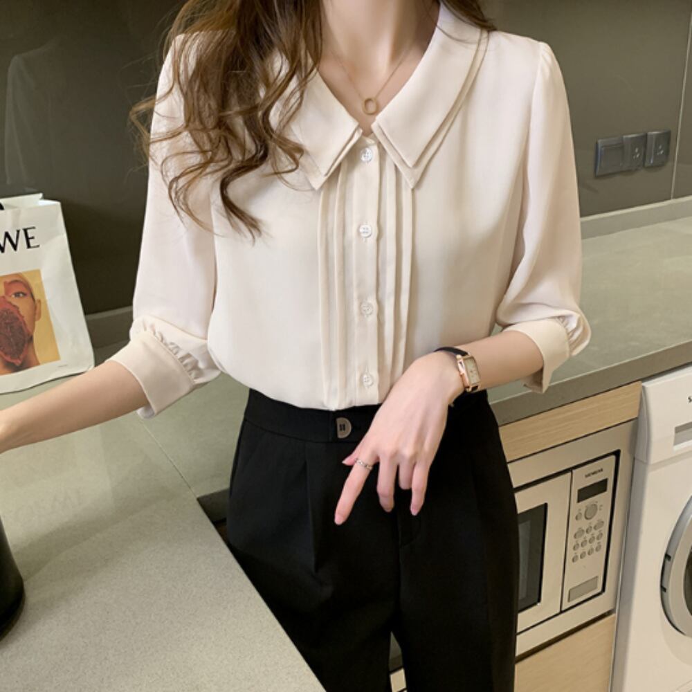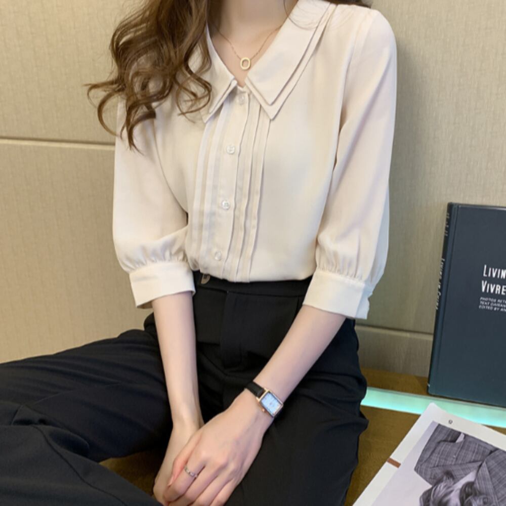 シフォンブラウス 5分袖 シャツブラウス トップス 無地 とろみ ブラウス 春 秋 キレイめ レディース かわいい 大人可愛い きれいめ シンプル カジュアル 上品 おしゃれ かっこいい こなれ感 ラフ 通勤 デート お出かけ 休日 バカンス ショッピング ホワイト S M L XL 2XL