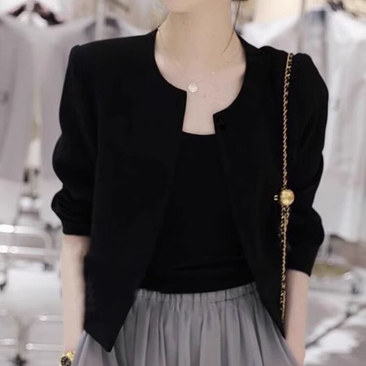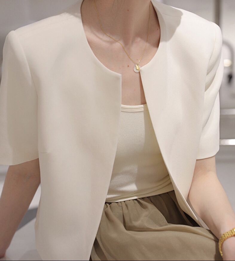 襟なしのデザインが首元をすっきりと見せ、スリムなシルエットが女性らしいラインを強調。大人可愛い雰囲気を演出し、あらゆるシーンで活躍します!
