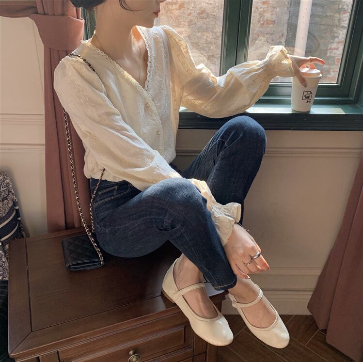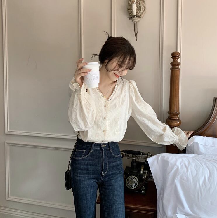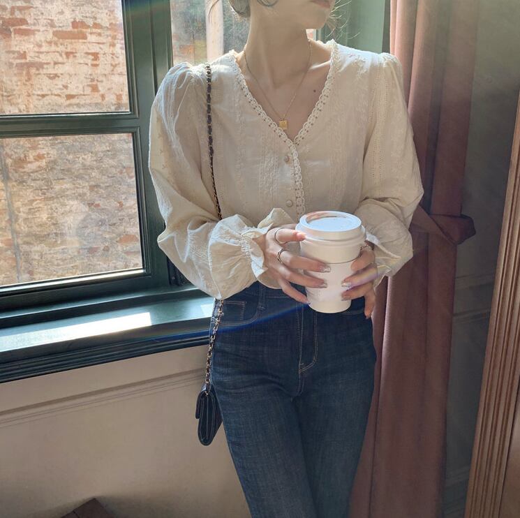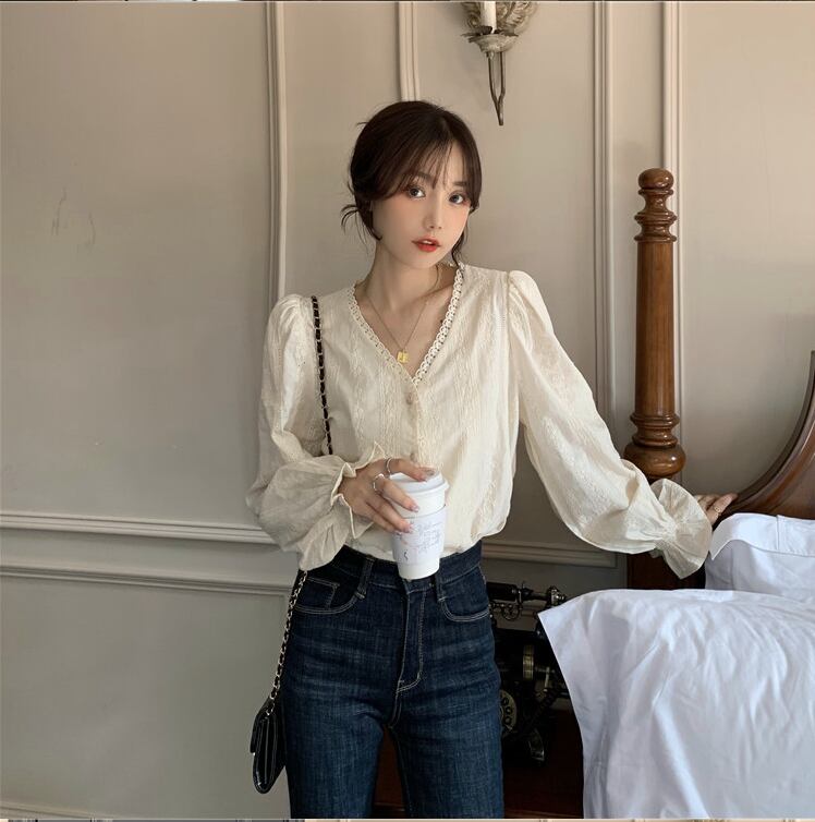 洗練された大人可愛い印象を与える、前開きの長袖シャツブラス。