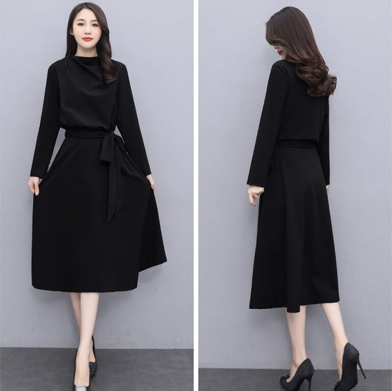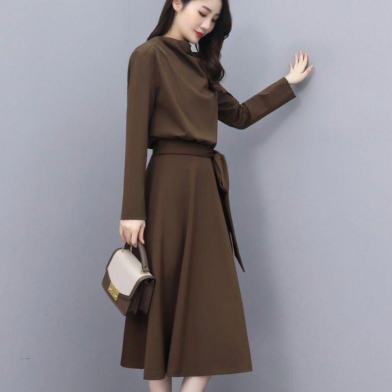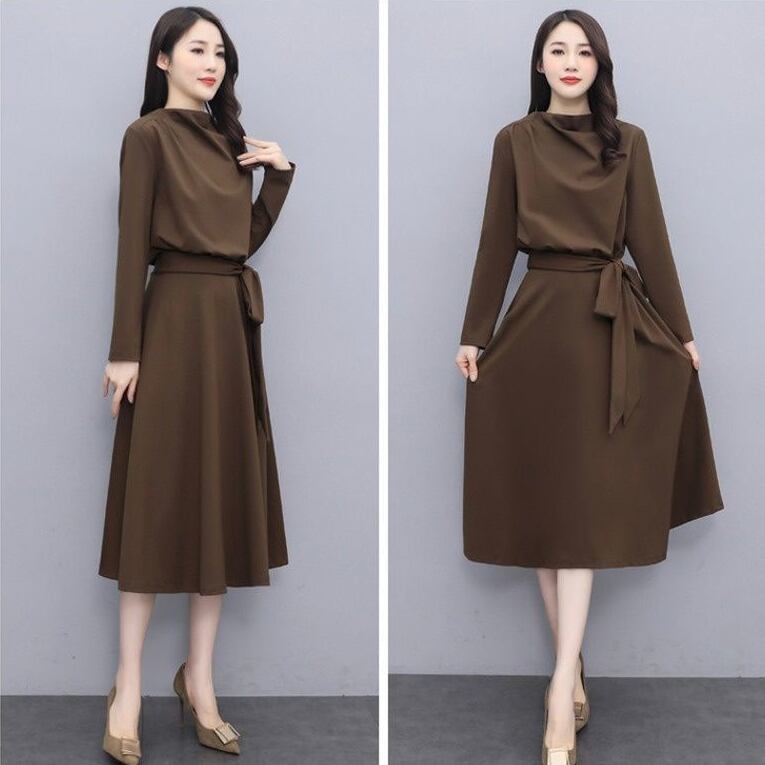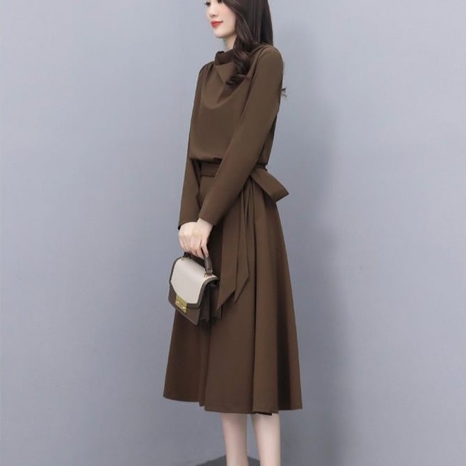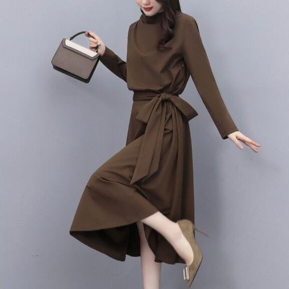 レディース ワンピース フレアスカート 長袖 ハイネック Aライン ウエストリボン 薄手 かわいい 大人可愛い きれいめ シンプル カジュアル 上品 おしゃれ こなれ感 エレガント 主役級 存在感 抜け感 ラブリー キュート 都会的 ロマンティック ナチュラル 無地 春 秋 デート お出かけ お泊まり パーティー イベント レストラン 公園 女子会 休日 ショッピング 韓国 コーデ 楽ちん 普段使い 着回し モテ 清楚 トレンド 流行 インスタ映え 定番 M L XL 2XL 黒 ブラック 茶色 ブラウン
