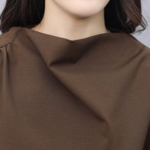 フレアスカートが魅力的なこの長袖ハイネックワンピースは、Aラインシルエットで女性らしいラインを強調します。