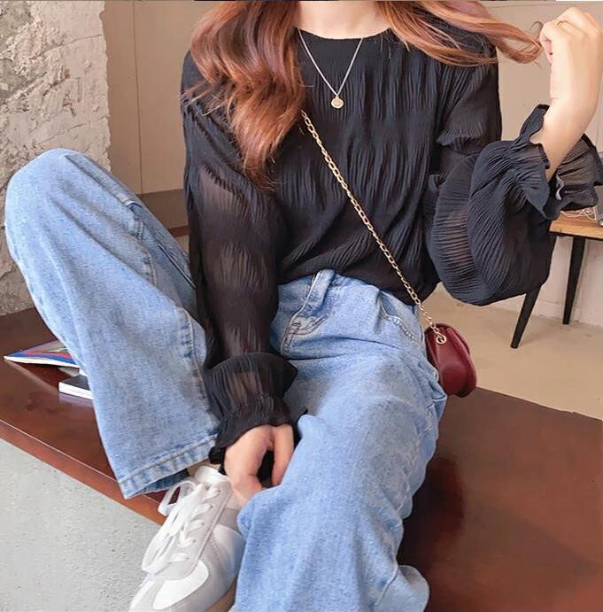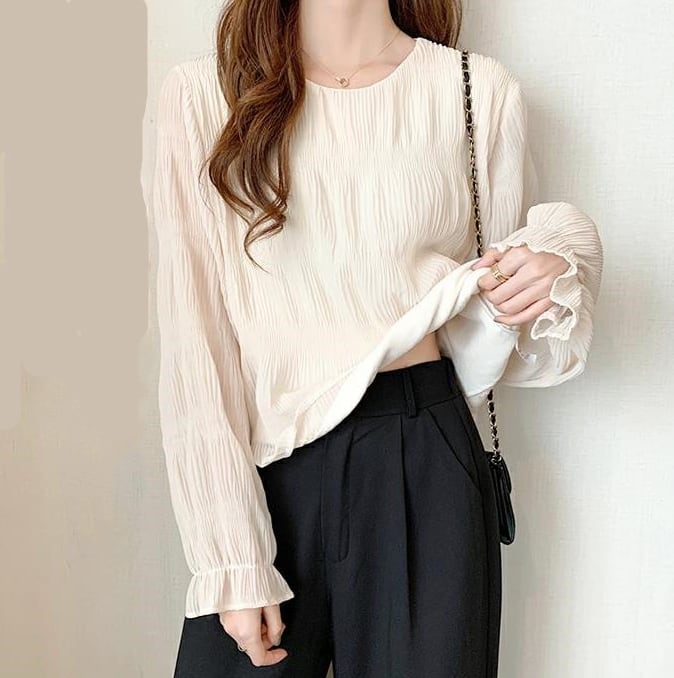 レディース トップス シャツ ブラウス カットソー 長袖 フリル袖 ラウンドネック シフォン 伸縮性 かわいい 大人可愛い きれいめ シンプル カジュアル 上品 おしゃれ こなれ感 ラフ 個性的 エレガント 主役級 存在感 抜け感 ラブリー キュート カントリー ロマンティック ナチュラル 無地 春 デート お出かけ お泊まり 公園 女子会 休日 韓国 コーデ 楽ちん プレゼント 普段使い 着回し モテ 清楚 トレンド 流行 インスタ映え 定番 M L XL ホワイト ブラック ピンク アプリコット グリ