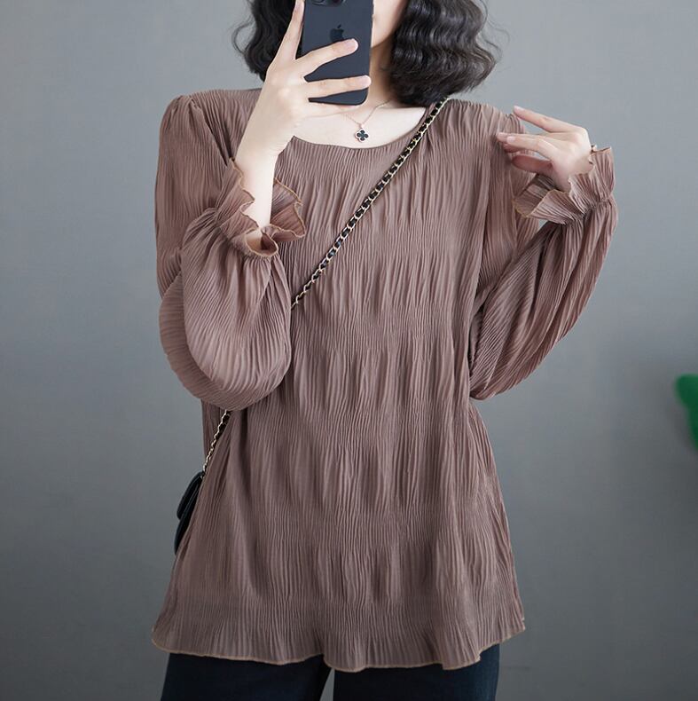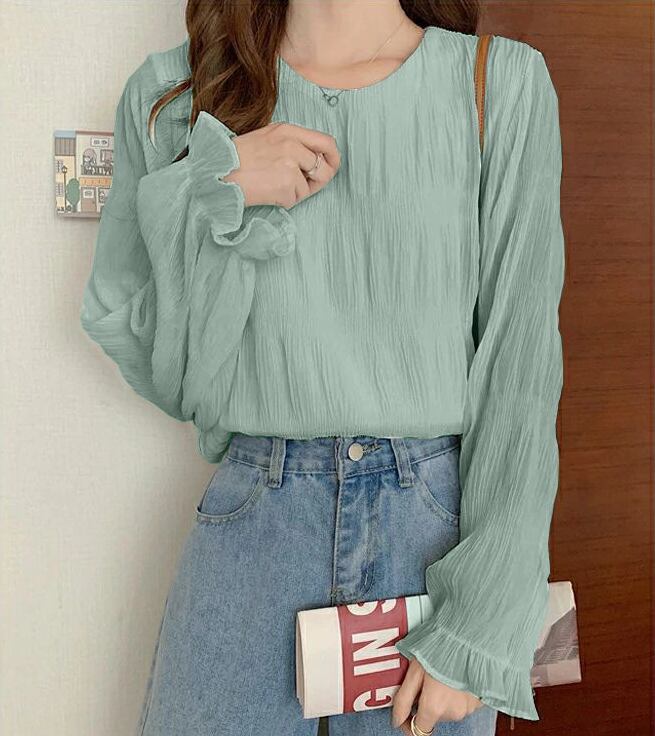 レディース トップス シャツ ブラウス カットソー!長袖のフリル袖とラウンドネックが特徴の、春のお出かけにぴったりな一着です。