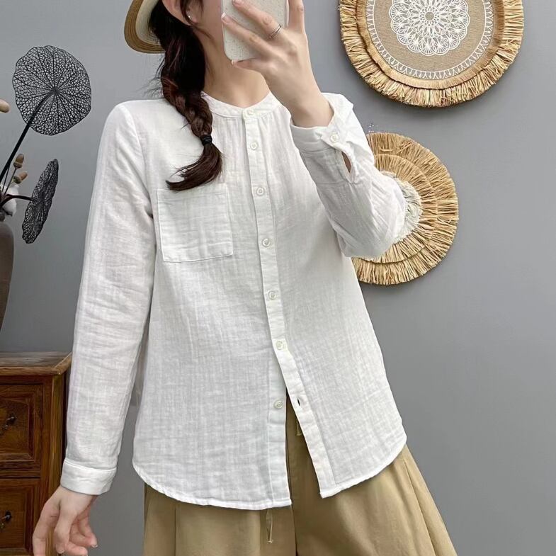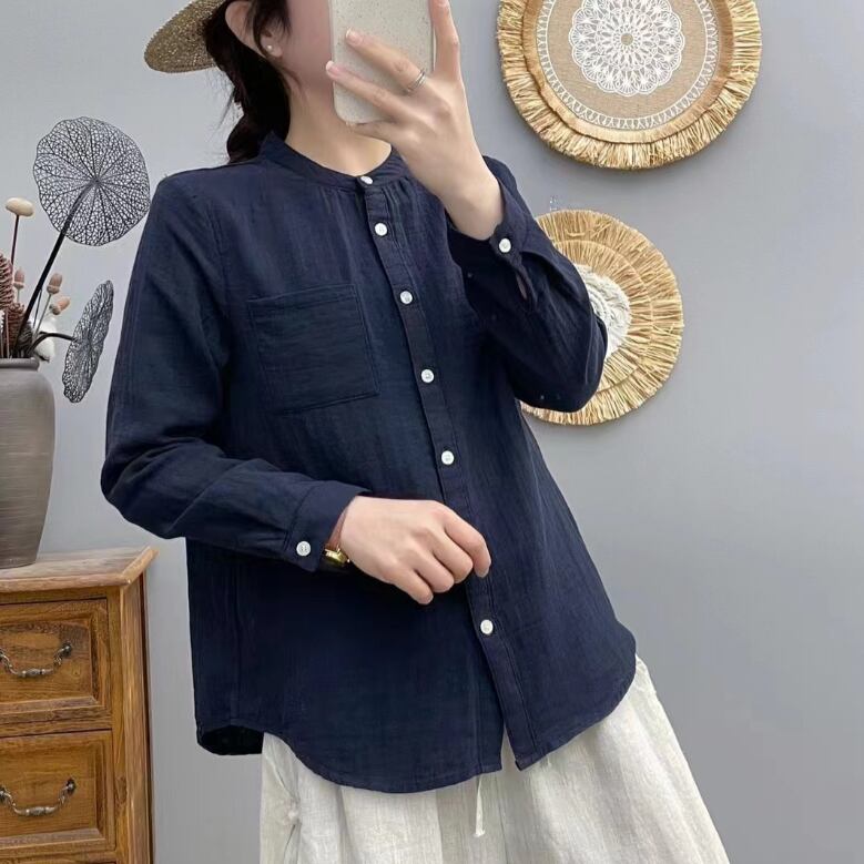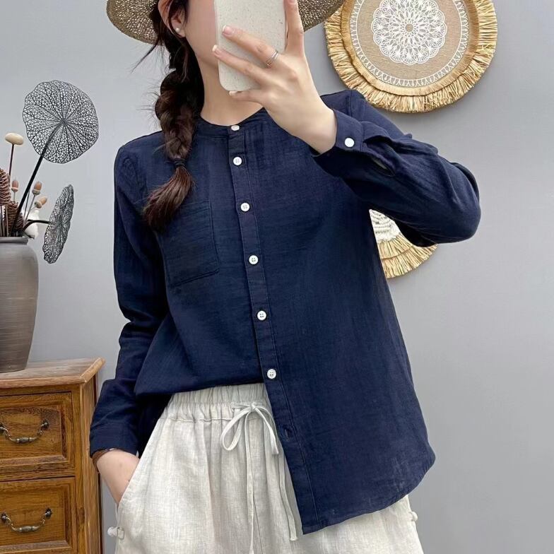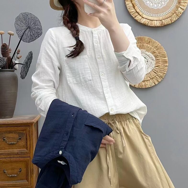 レディース トップス シャツ 長袖 ラウンドネック 襟なし スリム 細身 フェミニン ポケット ボタン かわいい 大人可愛い きれいめ シンプル カジュアル 上品 おしゃれ かっこいい こなれ感 ラフ ガーリー 主役級 存在感 抜け感 都会的 クラシカル カントリー ナチュラル 無地 春 通勤 デート お出かけ お泊まり 公園 女子会 休日 ショッピング 重ね着 韓国 コーデ プレゼント 普段使い 着回し モテ 清楚 トレンド 流行 インスタ映え 定番 M L XL 白 ホワイト ネイビー