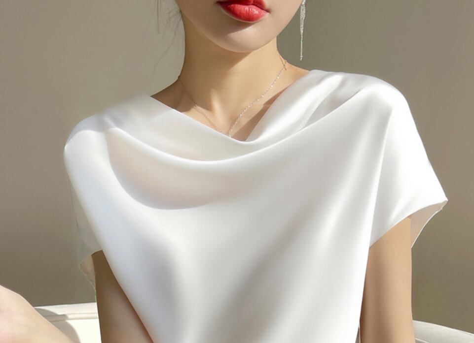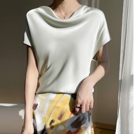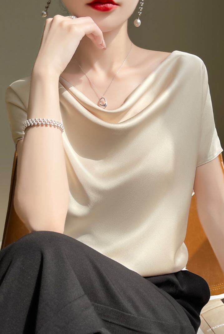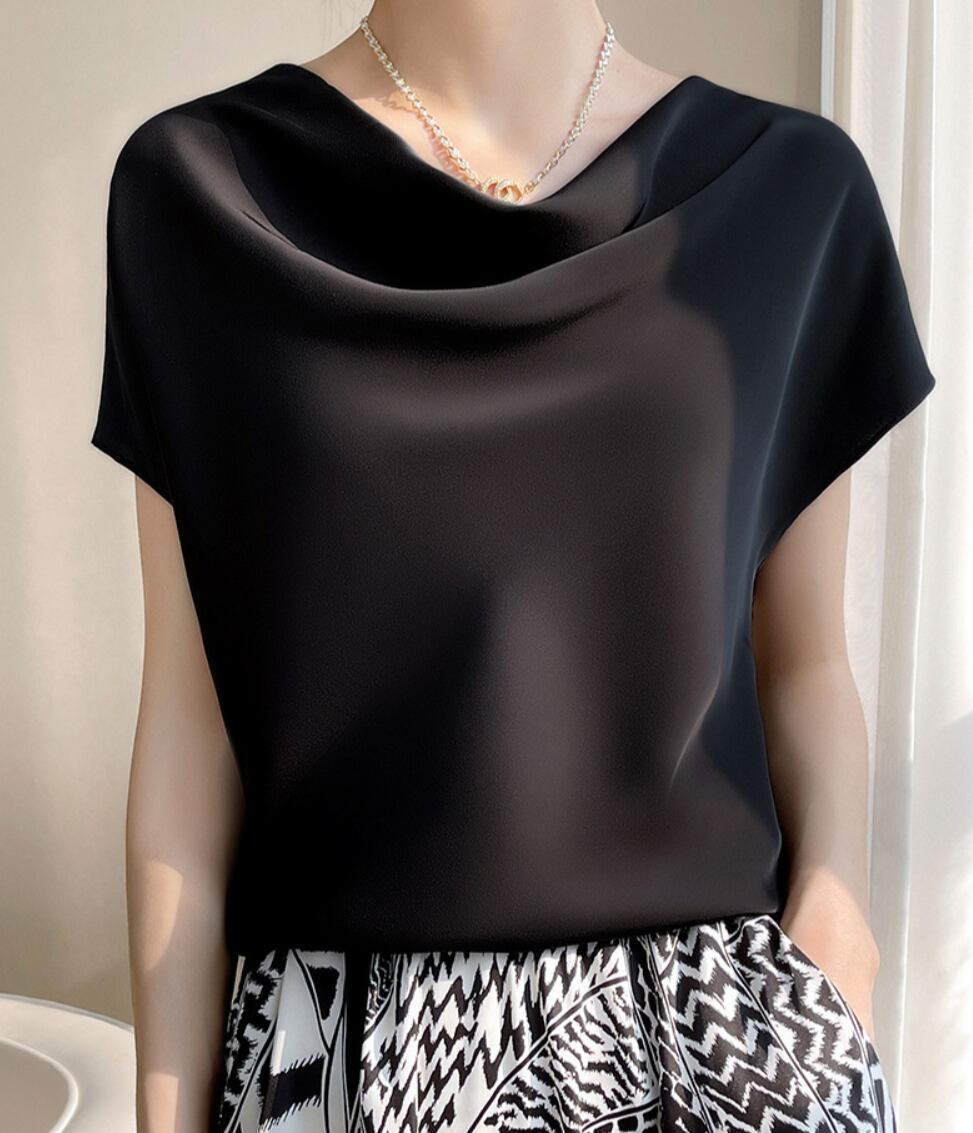 シンプルながらも存在感のあるブラウスです。半袖のラウンドネックデザインで、襟なしのスタイルが顔周りをすっきりと見せ、上品さを引き立てます。カジュアルからフォーマルまで多彩に活躍する一枚です。