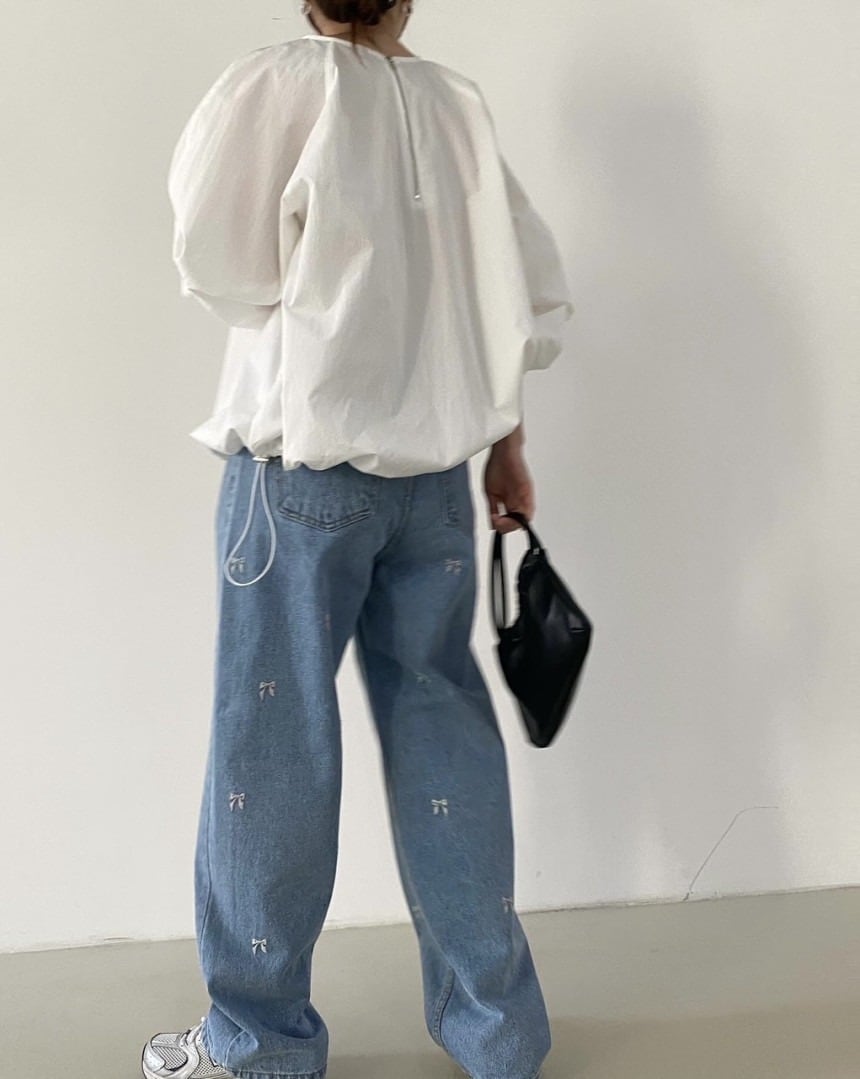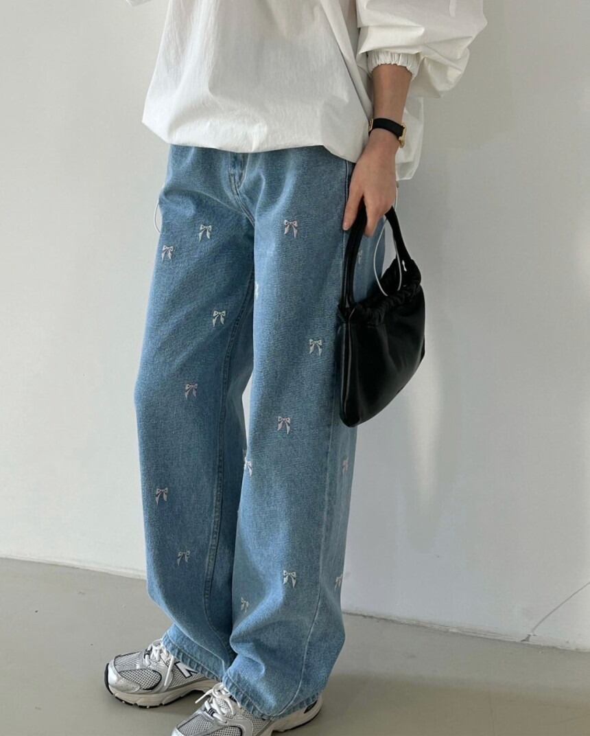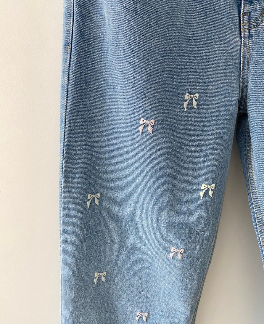 可愛らしいリボン刺繍が目を引く、ストレートデニムパンツです。