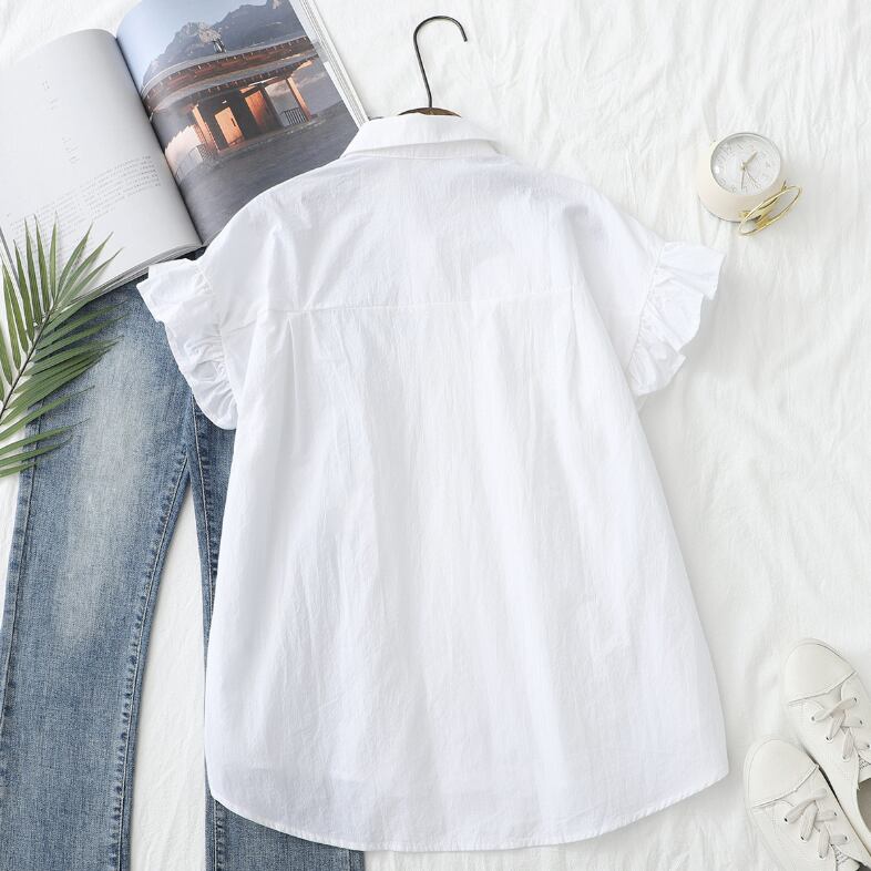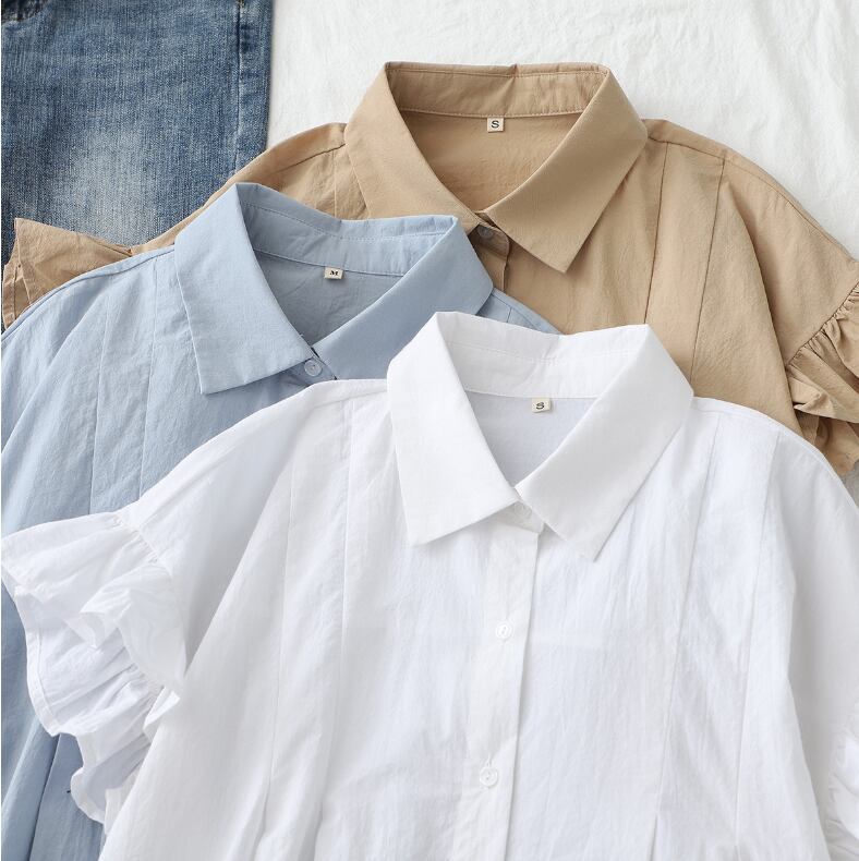 レディース トップス シャツ ブラウス 前開き 半袖 フリル袖 襟付き 角襟 スリム ボタン コットン かわいい 大人可愛い きれいめ シンプル カジュアル 上品 おしゃれ こなれ感 ラフ ガーリー エレガント 主役級 存在感 抜け感 ラブリー キュート 都会的 クラシカル カントリー ロマンティック ナチュラル 無地 夏 デート お出かけ お泊まり 公園 女子会 休日 ショッピング 韓国 コーデ 普段使い 着回し モテ 清楚 トレンド 流行 インスタ映え 定番 S M L 白 ホワイト カーキ ライトブ