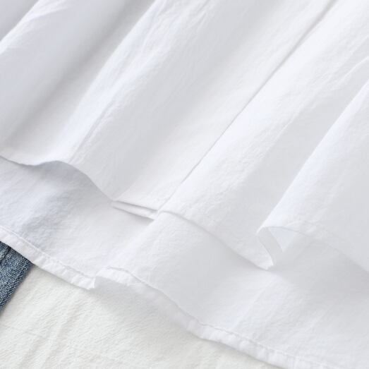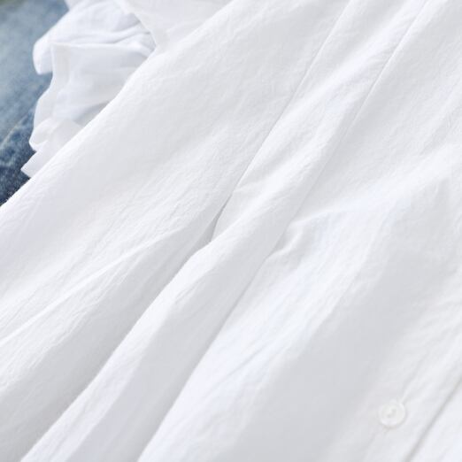 上品で洗練された印象のフリル袖ブラウス。エレガントな角襟デザインが、大人女性の魅力を引き立てます。