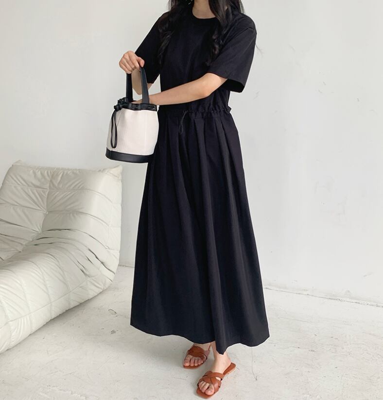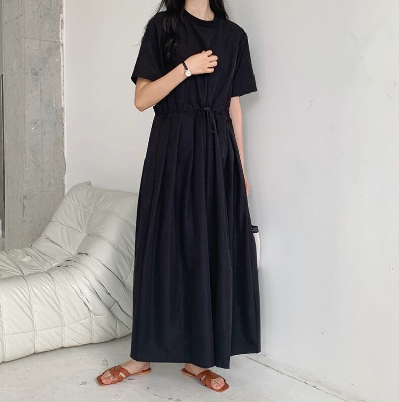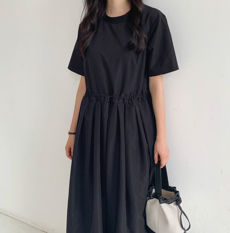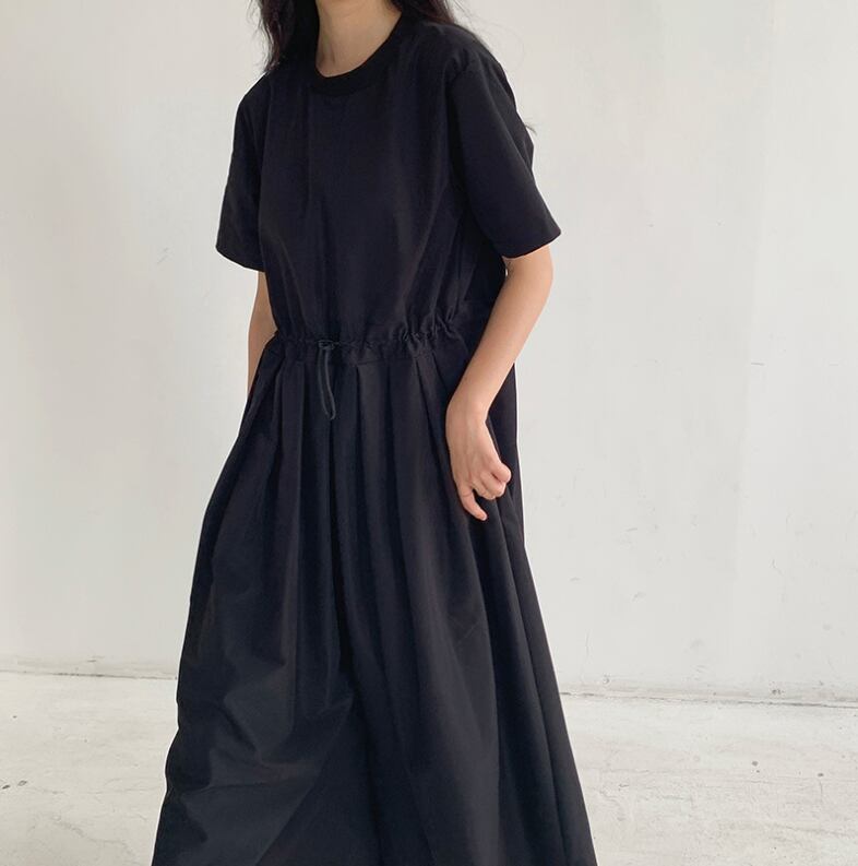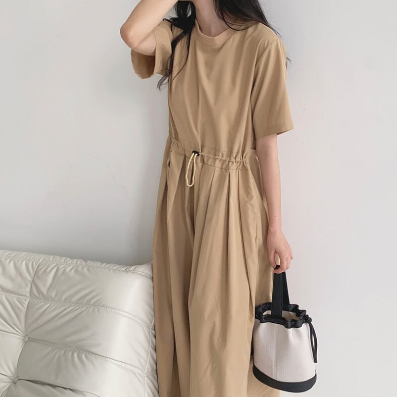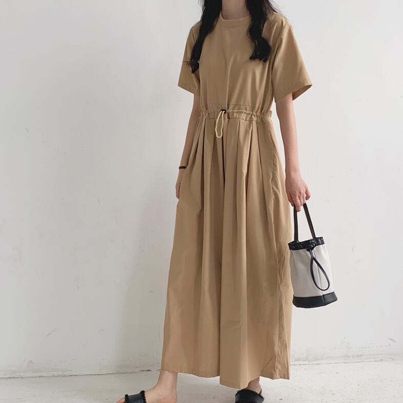 膝下のロング丈とハイウエストのシルエットが、スタイルアップを実現。半袖とラウンドネックのディテールが、カジュアルさと上品さを絶妙に融合させています。