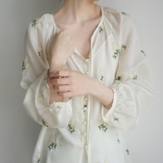 Vネックのデザインと長袖のシルエットが、上品さと可愛さを絶妙に演出。レースや刺繍のディテールが、ガーリーでエレガントな印象を与えます。