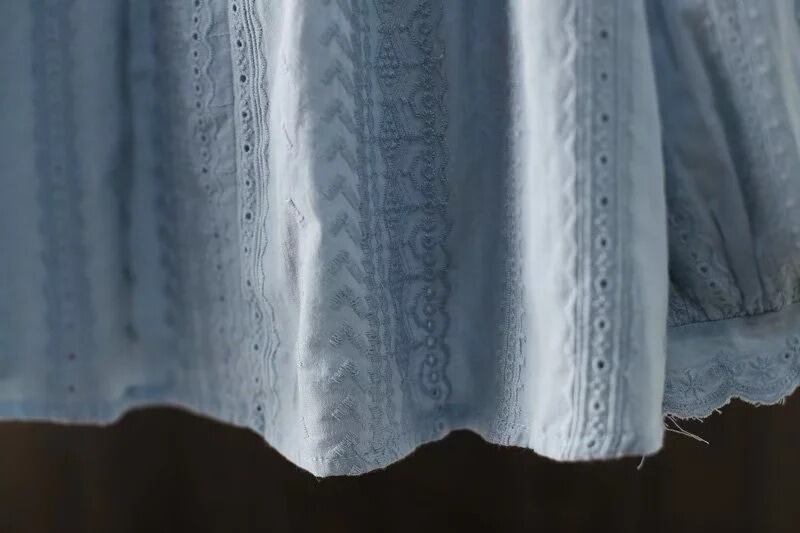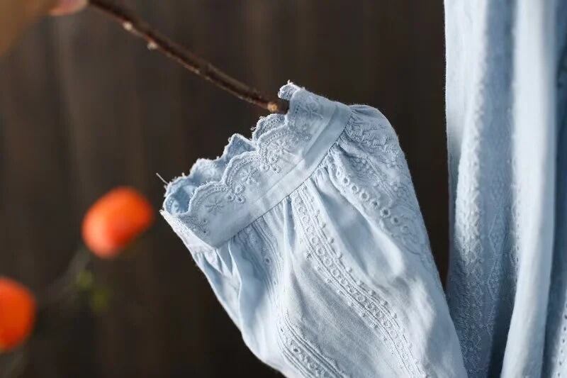 胸元から裾にかけて施されたピンタックが、縦のラインを美しく見せます。袖口や身頃にあしらわれたレースの透かし編みが、可憐なアクセント。ふんわりとしたシルエットで、一枚で主役級の存在感を放ちます。