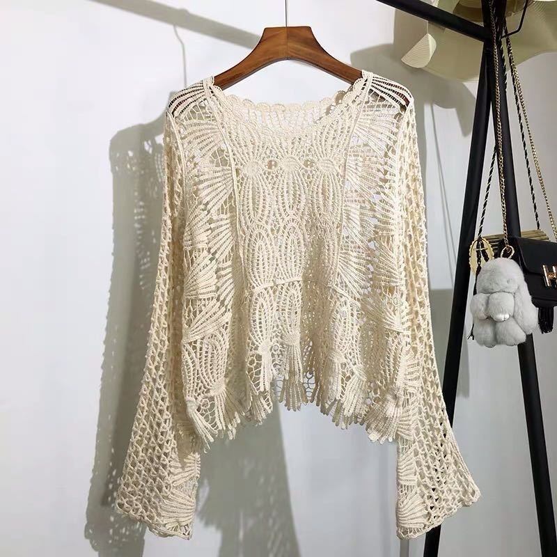 繊細な透かし編みが魅力の、デザイン性豊かなトップス。手仕事を感じさせる美しいクロシェパターンが、装いに華やかさを添えます。