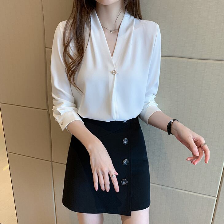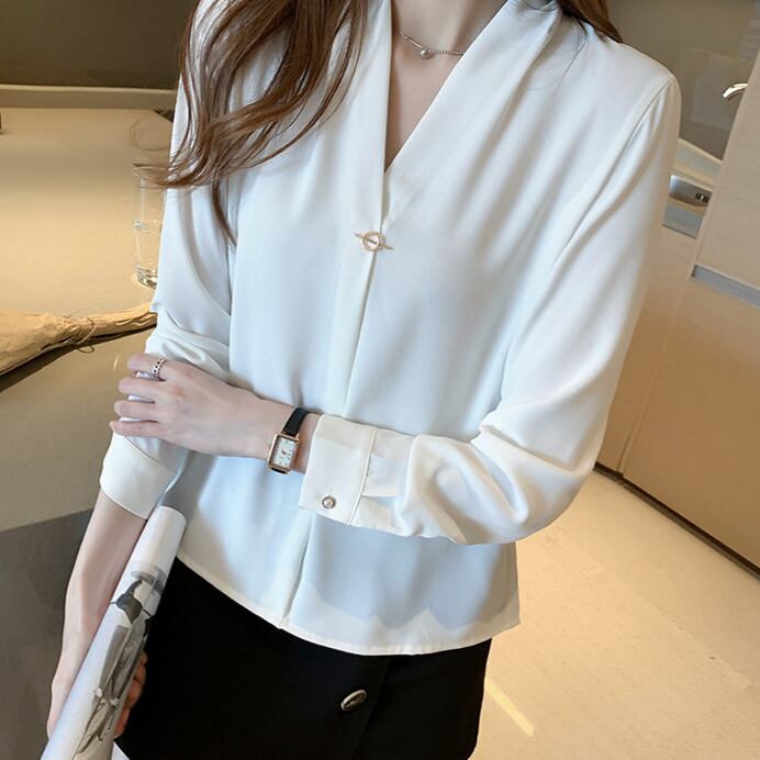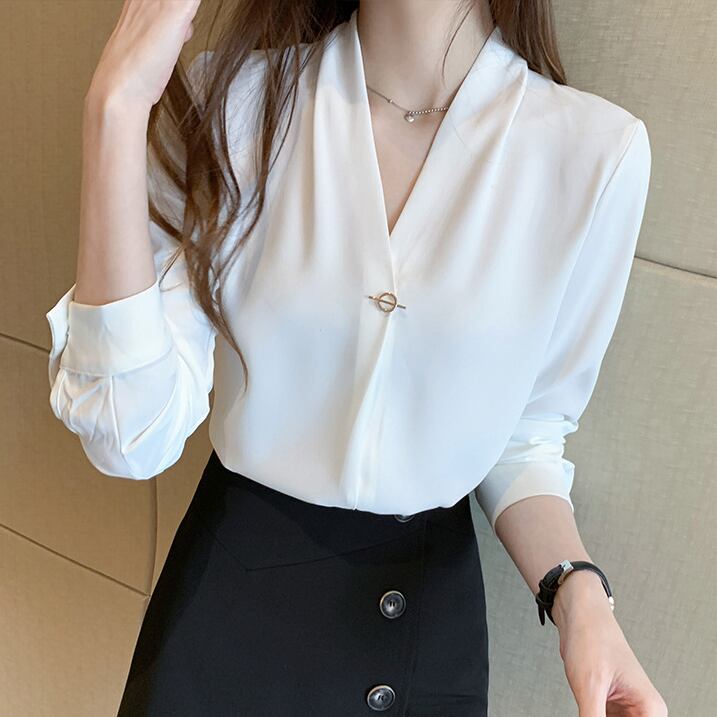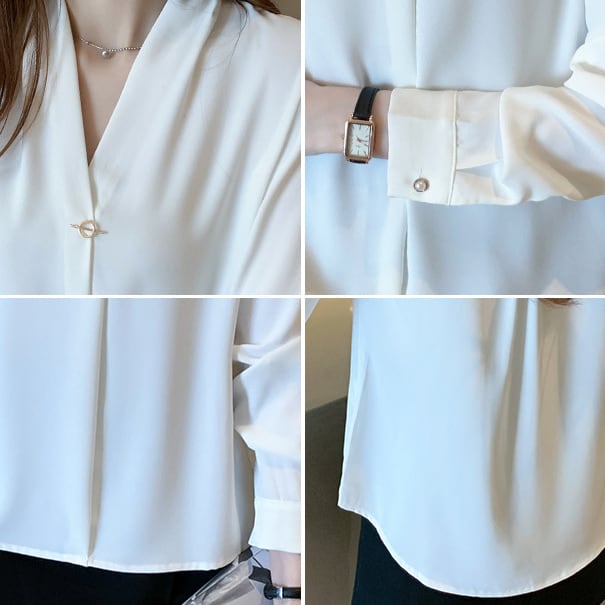 こちらの商品は、春秋にぴったりなレディース長袖ブラウスです。Vネックの襟なしデザインが、エレガントでありながらもリラックスした雰囲気を演出します。