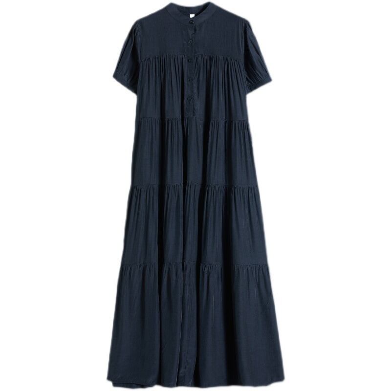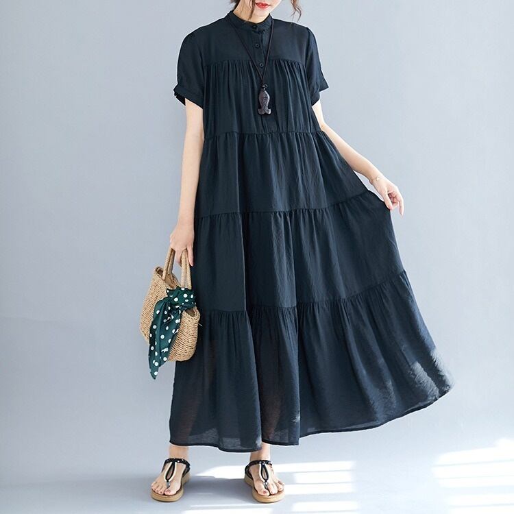 ワンピース シャツワンピ ティアード ロング マキシ 半袖 スタンドカラー バンドカラー Aライン フェミニン ルーズ ボタン ギャザー かわいい 大人可愛い シンプル カジュアル ガーリー ルーズ 主役級 キュート ベーシック ナチュラル 清潔感 リラックス 軽やか 無地 春 夏 ママ マタニティ 通勤 学生 学校 通学 デート お出かけ リゾート 旅行 レストラン 公園 女子会 バカンス 高原 ホテル ガーデン ショッピング カフェ 韓国 体型カバー 普段使い 着回し ゆったり ブラック