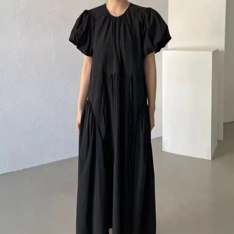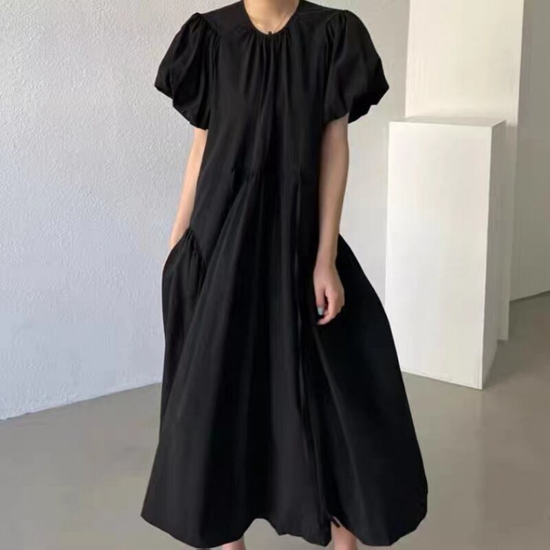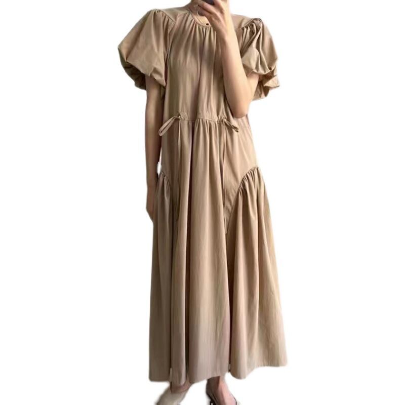 ワンピース 膝下 ロング マキシ 半袖 ボリューム袖 パフスリーブ ラウンドネック 襟なし ノーカラー フレア Aライン オーバーサイズ フェミニン ベルト ウエストマーク ギャザー かわいい カジュアル おしゃれ レトロ ナチュラル 無地 夏 ママ 学生 学校 通学 デート お出かけ イベント リゾート 旅行 レストラン 女子会 休日 高原 ホテル ガーデン ショッピング カフェ ゆったり フリーサイズ 黒 ブラック カーキ ベーシックカラー 大人カラー
