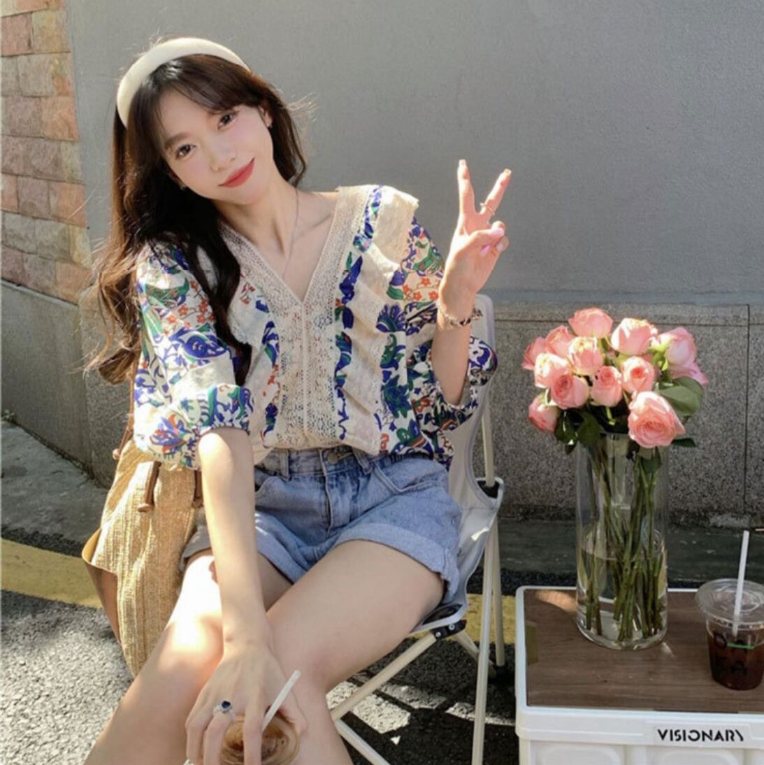 半袖と5分袖のパフスリーブが特徴で、涼しげなVネックが顔周りをすっきり見せ、存在感を演出します。このブラウスは、カジュアルにもエレガントにも着こなせる万能アイテムです!