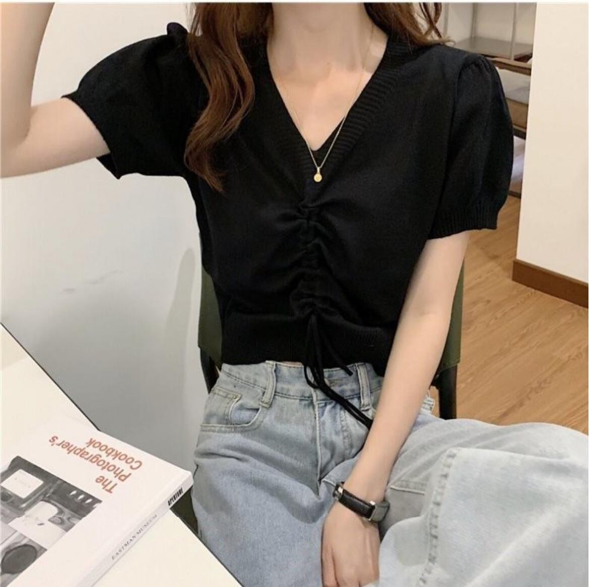 フェミニンなVネックデザインとドロストギャザーで抜け感を演出し、体型カバーも叶えます。