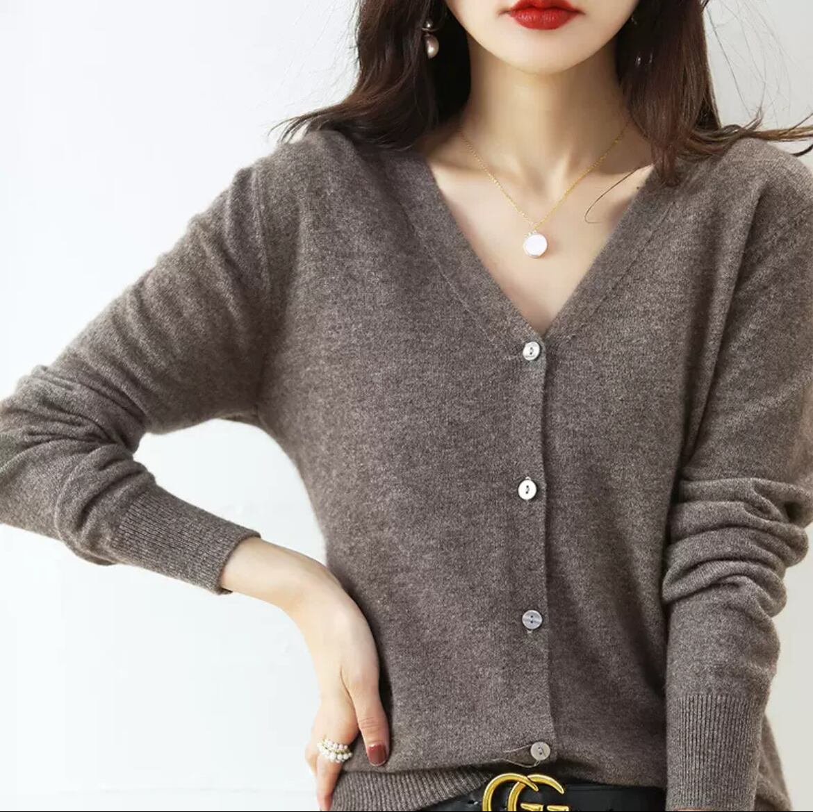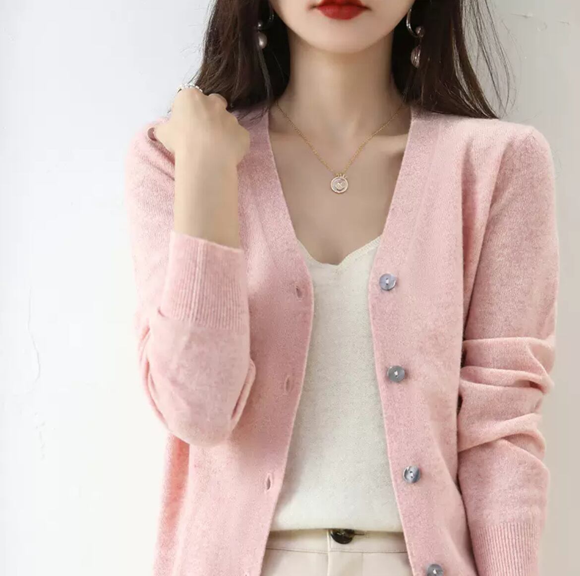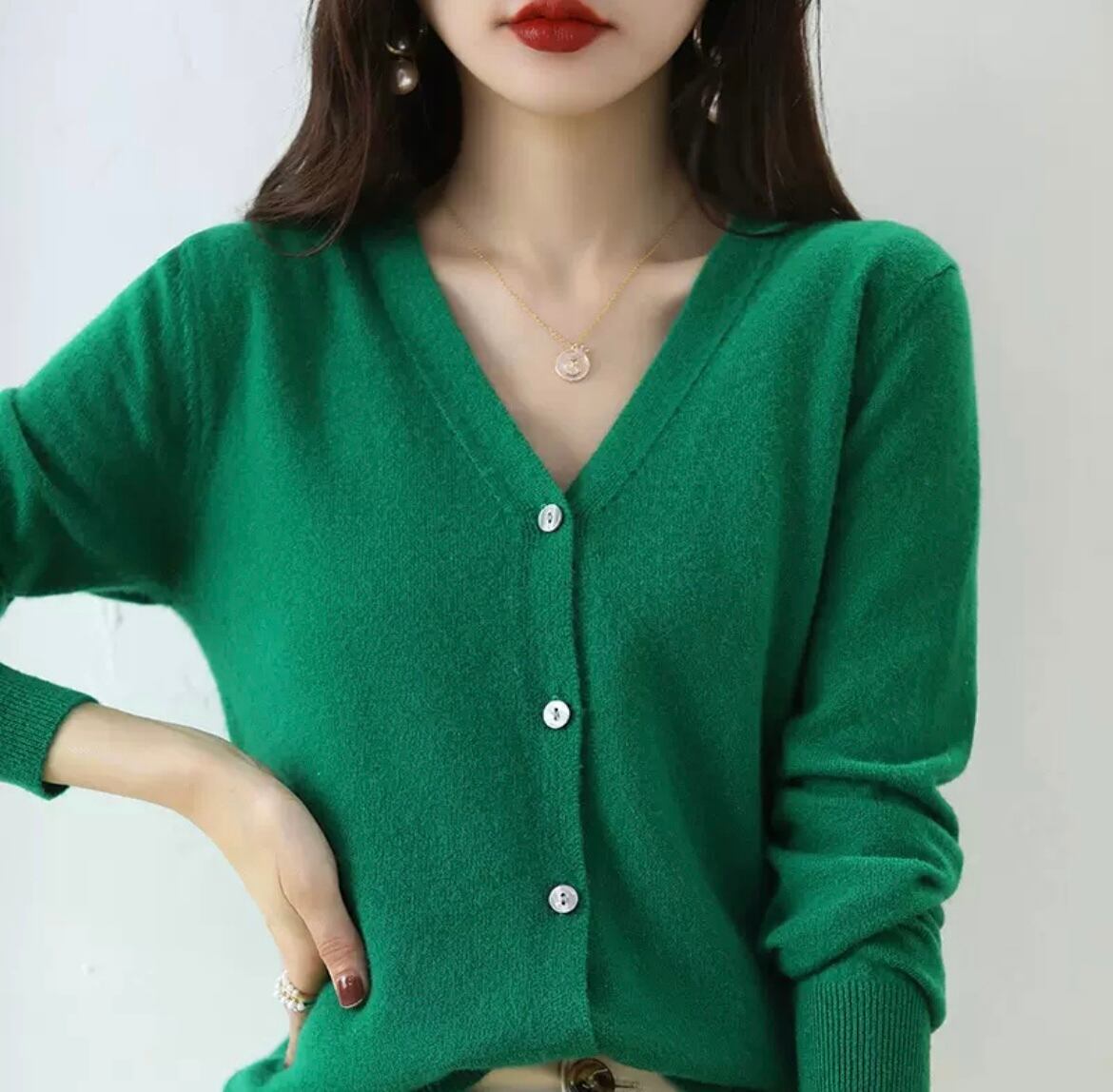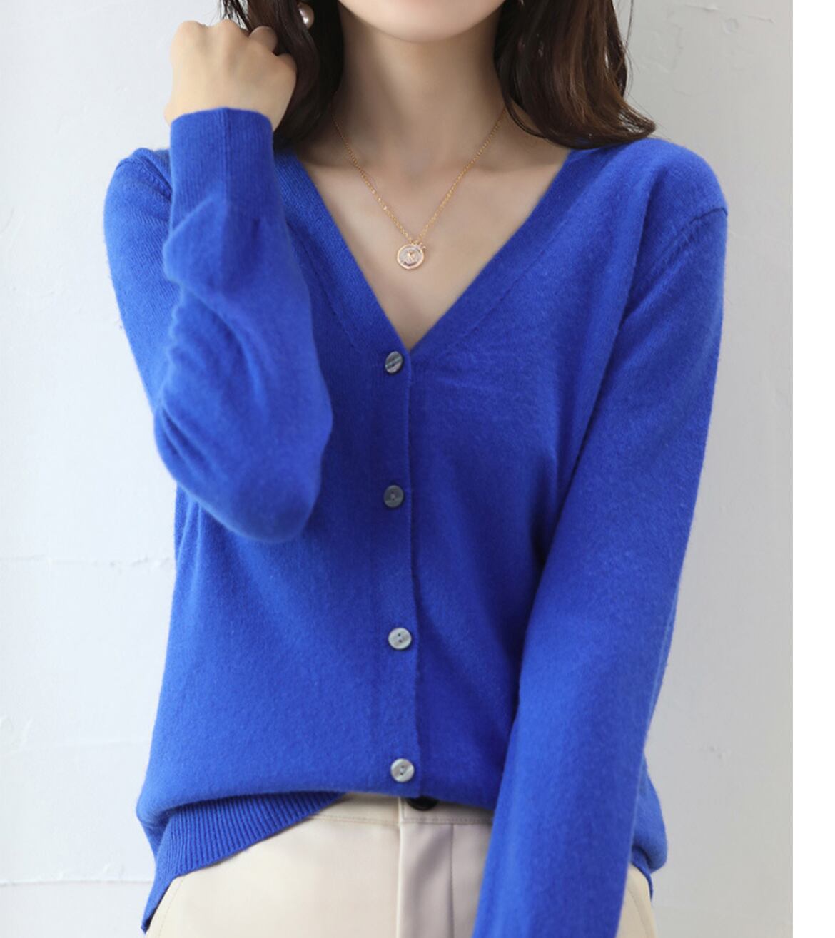 長袖のVネックデザインが、女性らしいシルエットを引き立て、快適な着心地を与えてくれます。