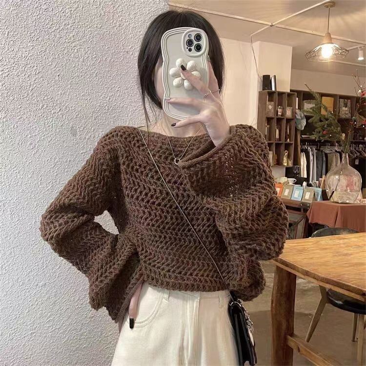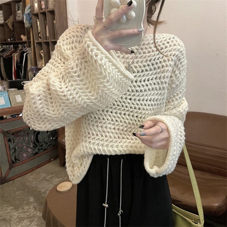 ざっくり編まれたニット素材で涼しげな印象を与え、ボリューム袖が女性らしさを引き立てます。