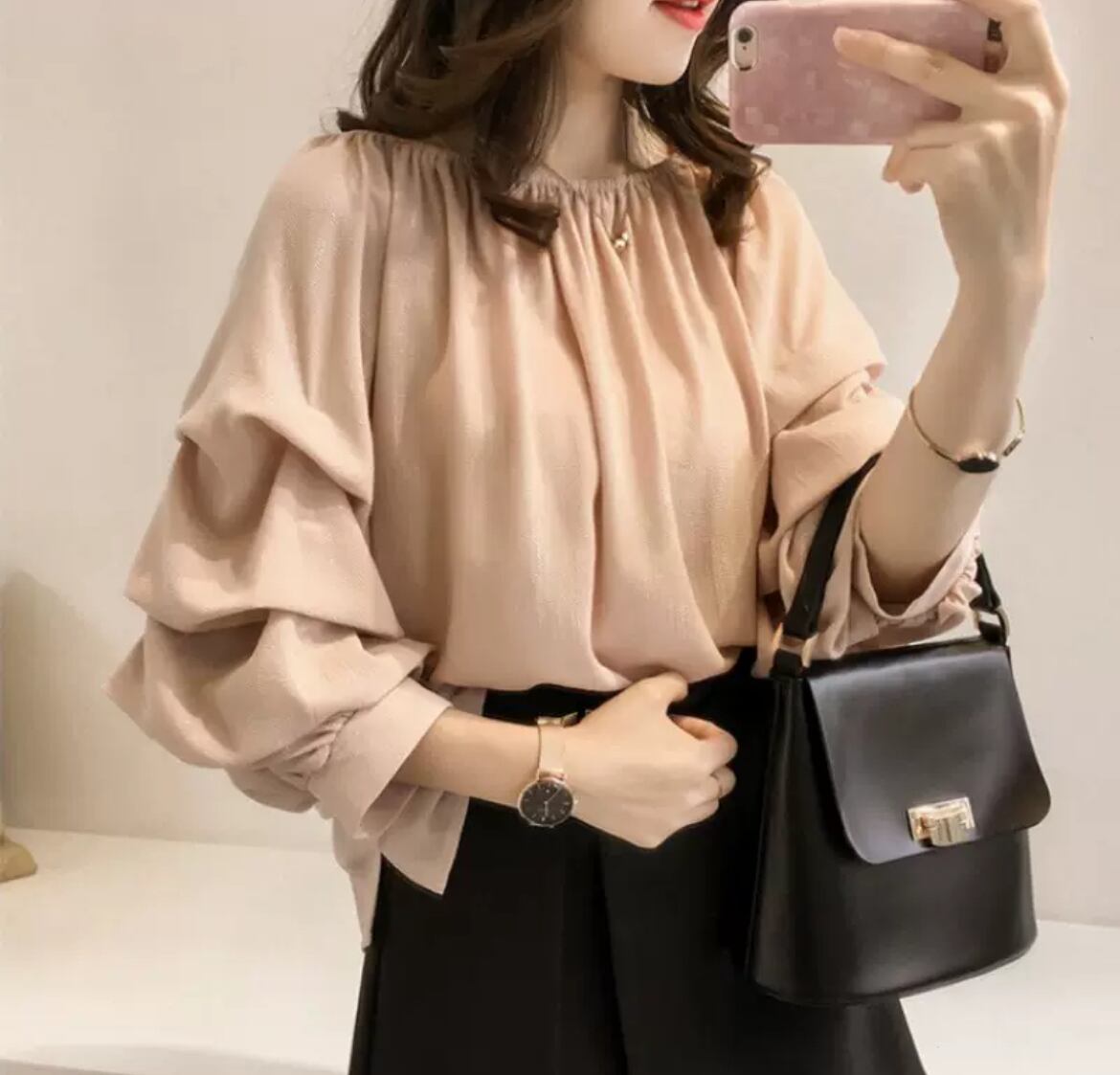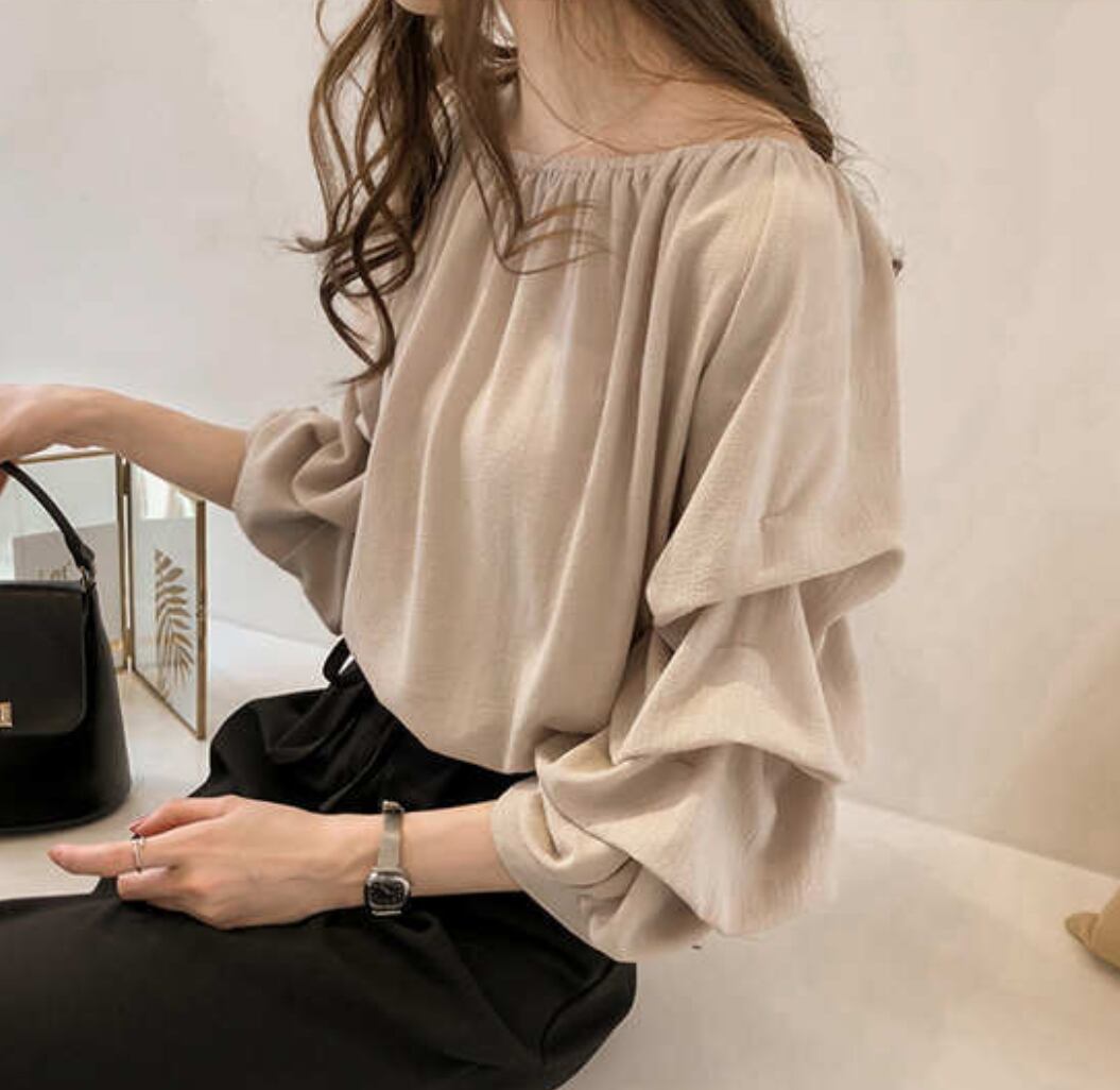 ボリューム袖と7分袖のデザインが、抜け感を演出しつつ上品さを保ち、シンプルながらもおしゃれなコーディネートにぴったりです。