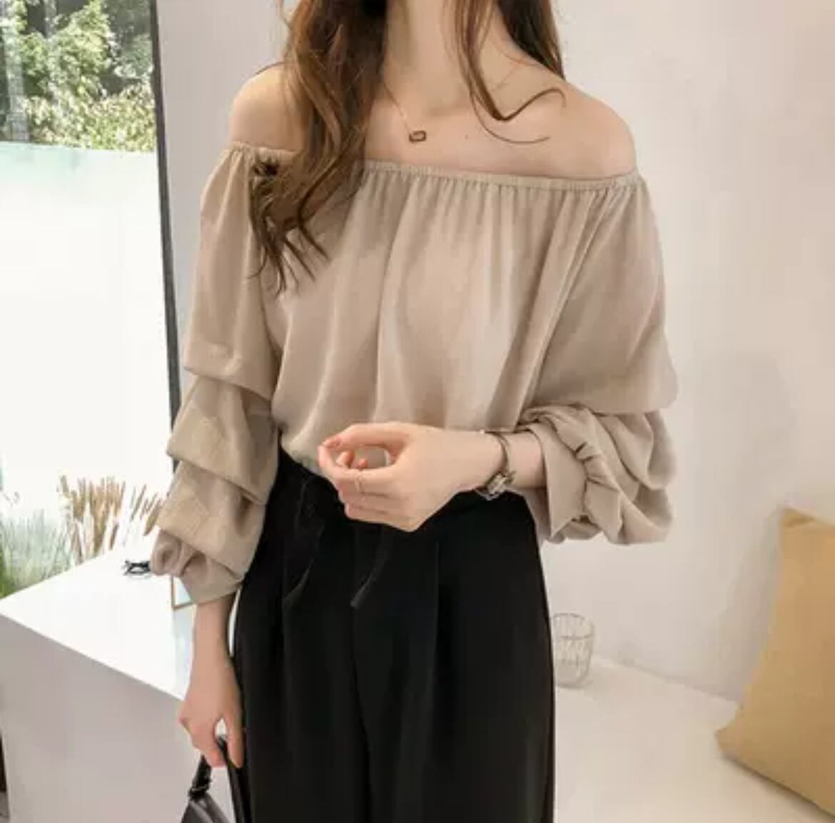 トップス シャツ ブラウス プルオーバー レディース クロップド丈 7分袖 ボリューム袖 オフショルダー ドレープ フェミニン シフォン 2way ゆるふわ 大人可愛い シンプル 上品 おしゃれ こなれ感 ガーリー ルーズ エレガント 抜け感 ナチュラル リラックス 軽やか 無地 春 夏 オフィス OL 通勤 デート お出かけ イベント 女子会 休日 韓国 オルチャン コーデ 楽ちん 体型カバー 普段使い 着回し 清楚 トレンド M L XL 2XL 3XL 大きいサイズ グレー ベージュ ピンク