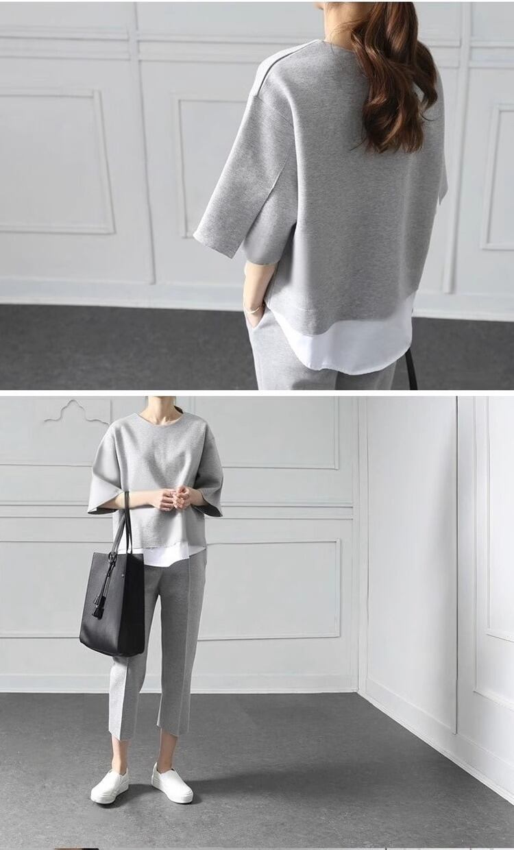 セットアップ 2点セット トップス プルオーバー カットソー 七分袖 レディース ラウンドネック ゆったり ボトムス カプリパンツ ストレート フェミニン かわいい 大人可愛い シンプル カジュアル おしゃれ レトロ こなれ感 ガーリー ラブリー キュート ベーシック ロマンティック 無地 春 秋 学生 デート お出かけ 女子会 休日 ショッピング 普段使い 着回し S M L XL 2XL グレー 定番カラー