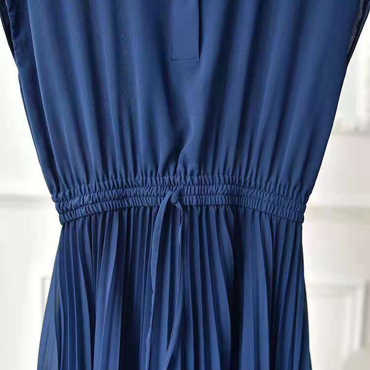 軽やかな透け感とプリーツの揺れが目を引く、膝下丈のフレアワンピース。