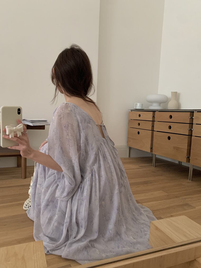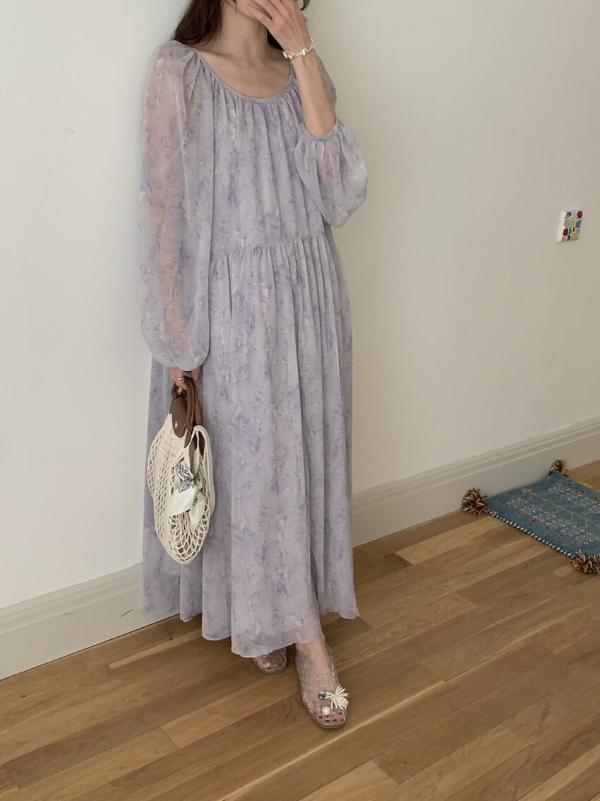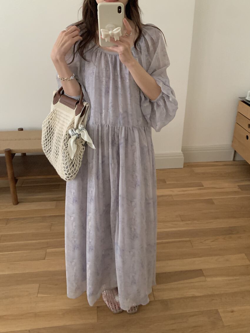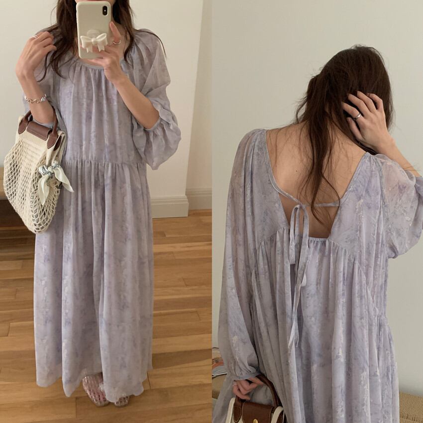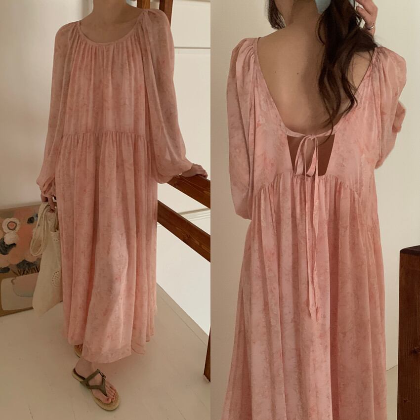 レディース ワンピース ドレス 丈長 長袖 ボリューム袖 Uネック 背中開き オーバーサイズ フェミニン バックリボン バックコンシャス ふっくら ギャザー シャーリング シアー かわいい 大人可愛い おしゃれ ラフ ガーリー 抜け感 ラブリー キュート ナチュラル 涼しげ リラックス 軽やか 花柄 春 夏 ママ デート お出かけ お泊まり リゾート 旅行 公園 休日 高原 ガーデン ショッピング お花見 カフェ ランチ 楽ちん ゆったり ゆる フリーサイズ 紫 パープル ピンク