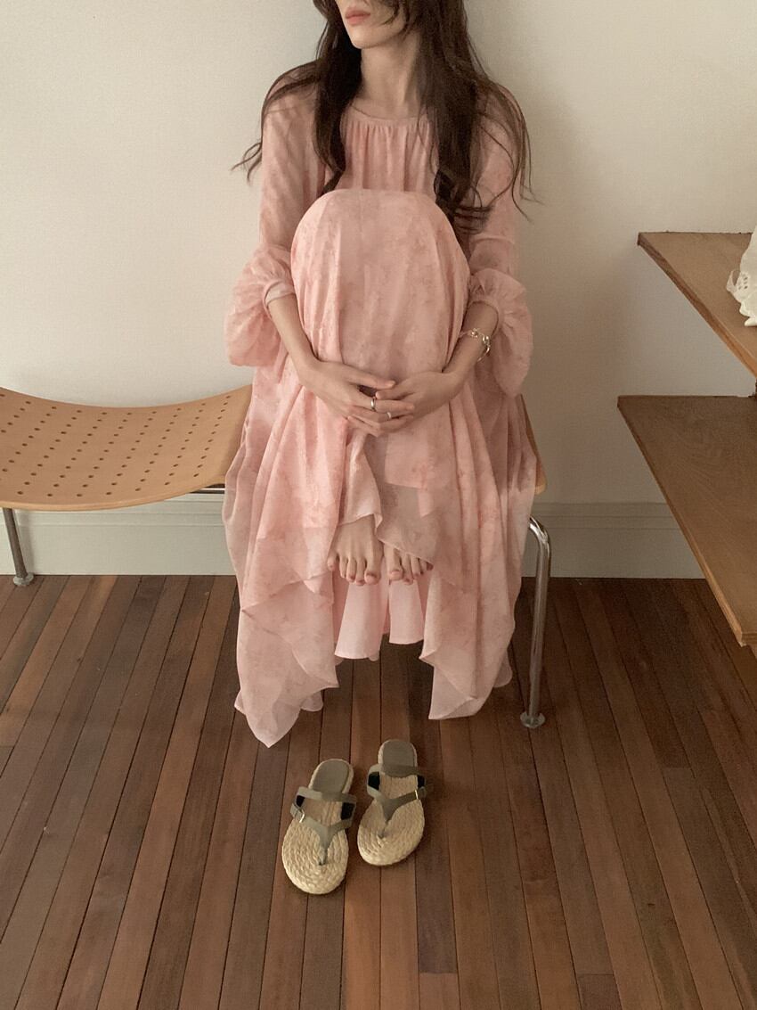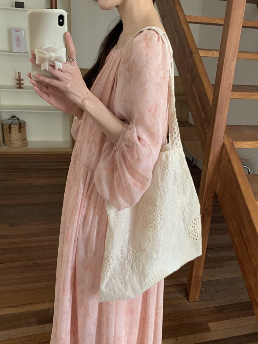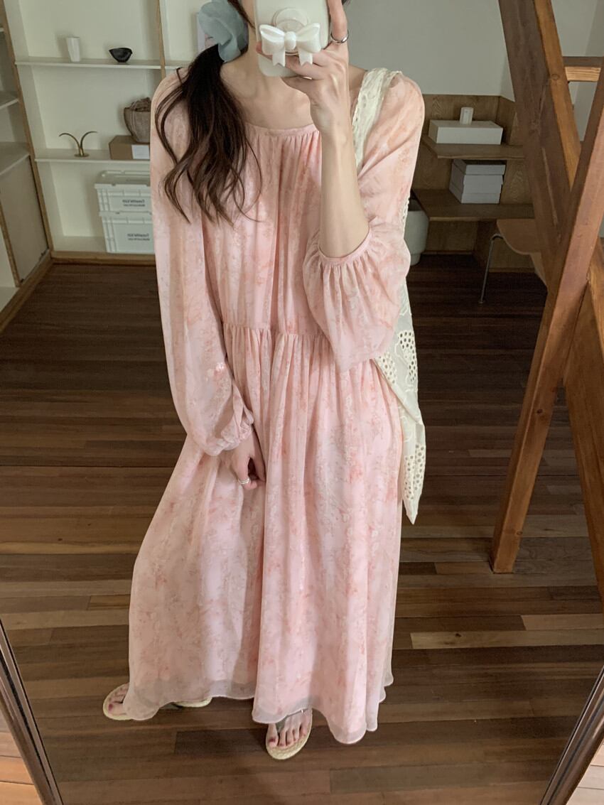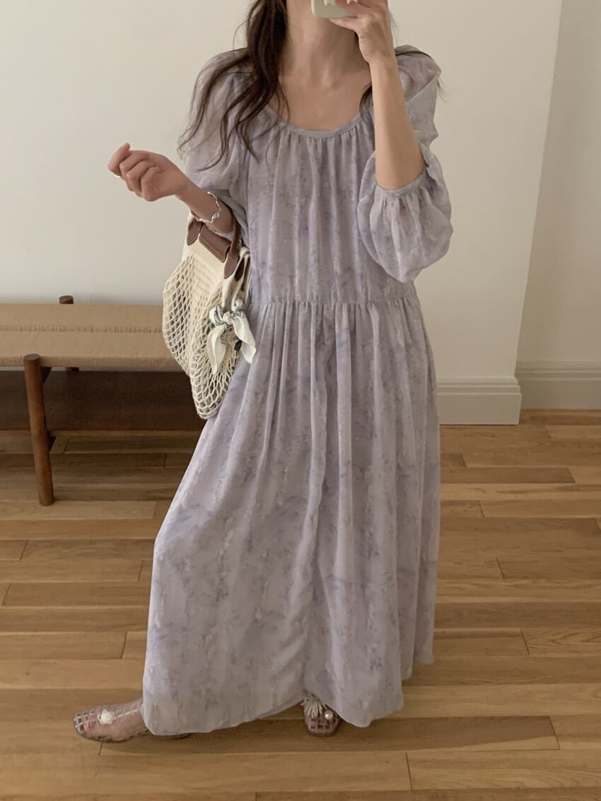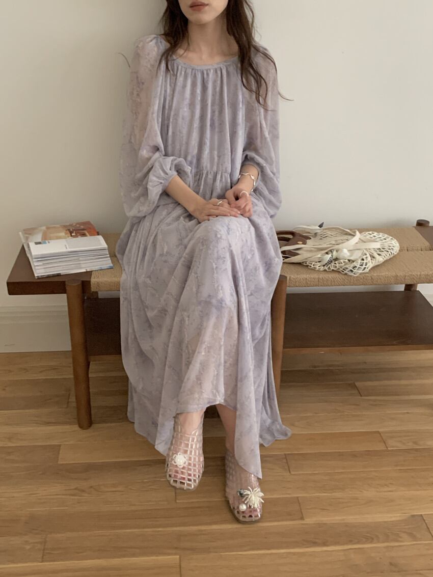 レディース ワンピース ドレス 丈長 長袖 ボリューム袖 Uネック 背中開き オーバーサイズ フェミニン バックリボン バックコンシャス ふっくら ギャザー シャーリング シアー かわいい 大人可愛い おしゃれ ラフ ガーリー 抜け感 ラブリー キュート ナチュラル 涼しげ リラックス 軽やか 花柄 春 夏 ママ デート お出かけ お泊まり リゾート 旅行 公園 休日 高原 ガーデン ショッピング お花見 カフェ ランチ 楽ちん ゆったり ゆる フリーサイズ 紫 パープル ピンク