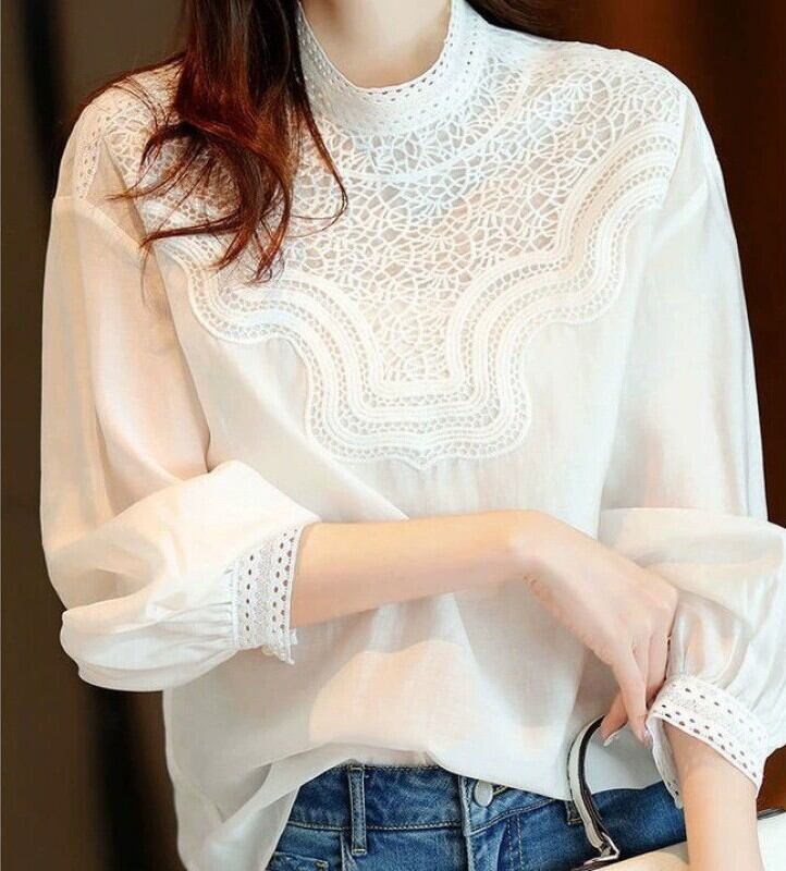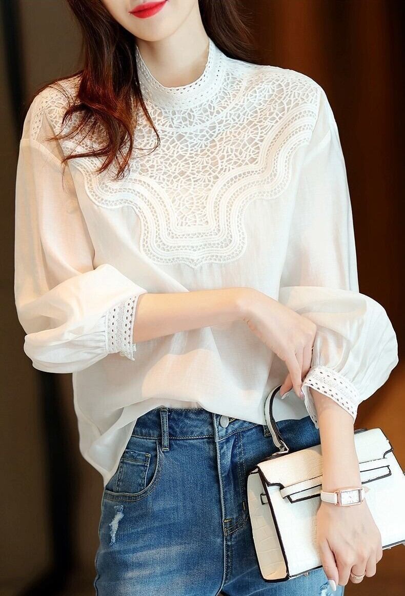 トップス シャツ ブラウス レディース 7分袖 ボリューム袖 パフスリーブ モックネック スタンドカラー ワイド ストレート フェミニン レース 刺繍 ふわふわ 透け感 切り替えデザイン 綿 コットン ポリエステル かわいい 大人可愛い カジュアル 上品 おしゃれ レトロ エキゾチック ガーリー 個性的 エレガント 無地 春 秋 授業参観 オフィス OL 通勤 デート レストラン 女子会 休日 ショッピング 発表会 コンサート 重ね着 普段使い 着回し 清楚 インスタ映え S M L XL 白 ホワイト