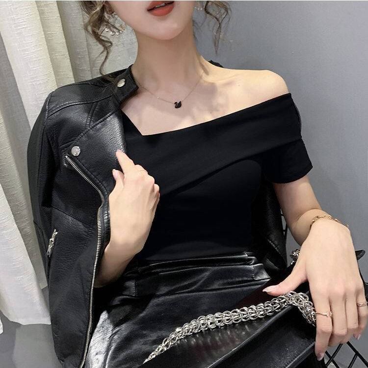 アシンメトリーなネックラインのデザインが視線を惹きつける、タイトシルエットの半袖カットソー。