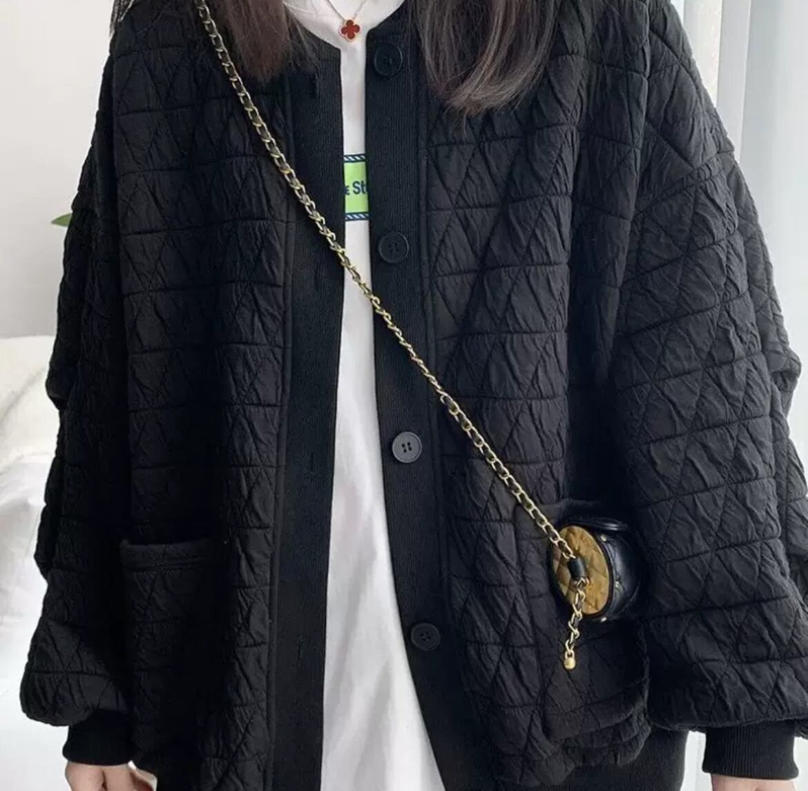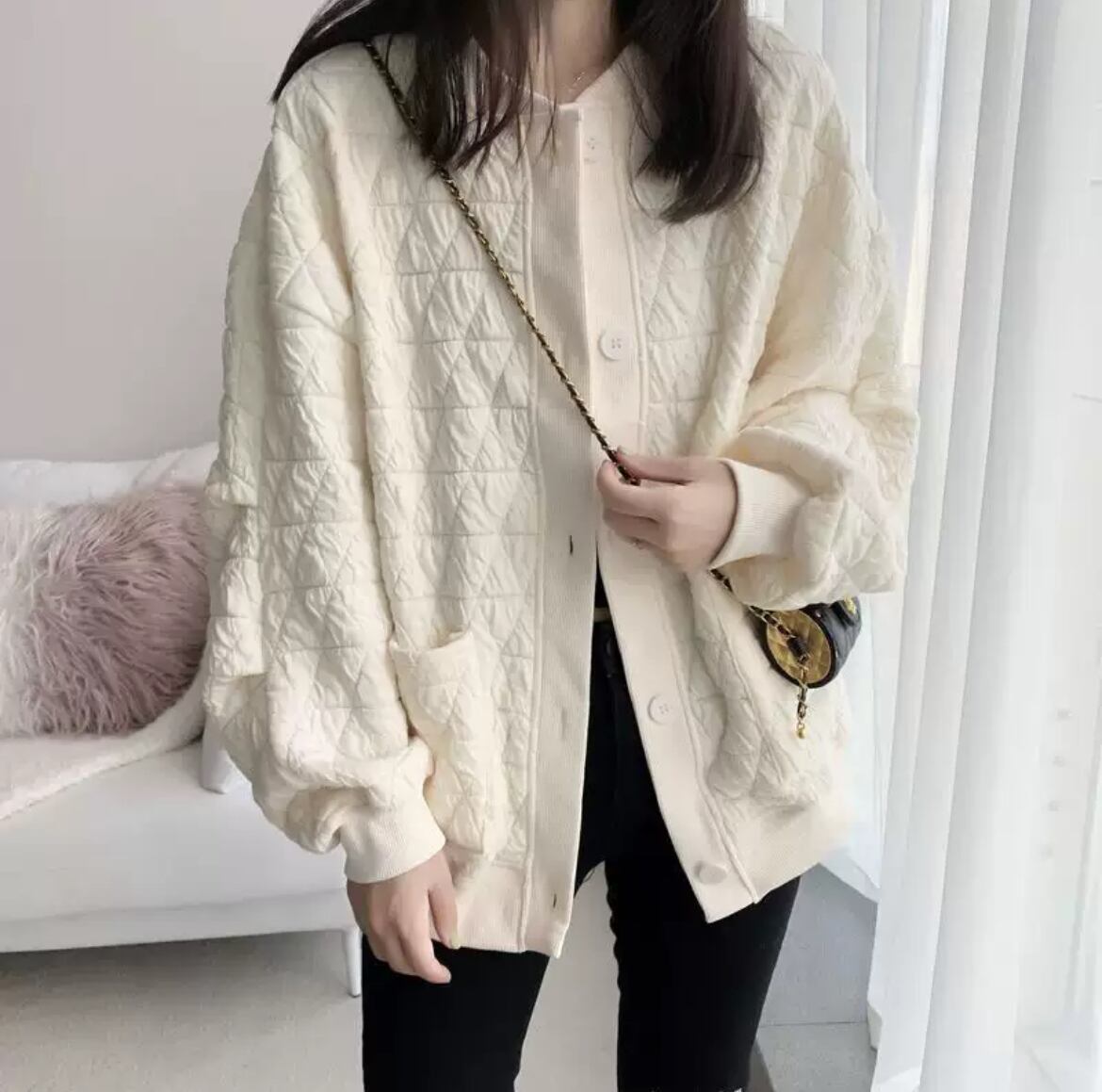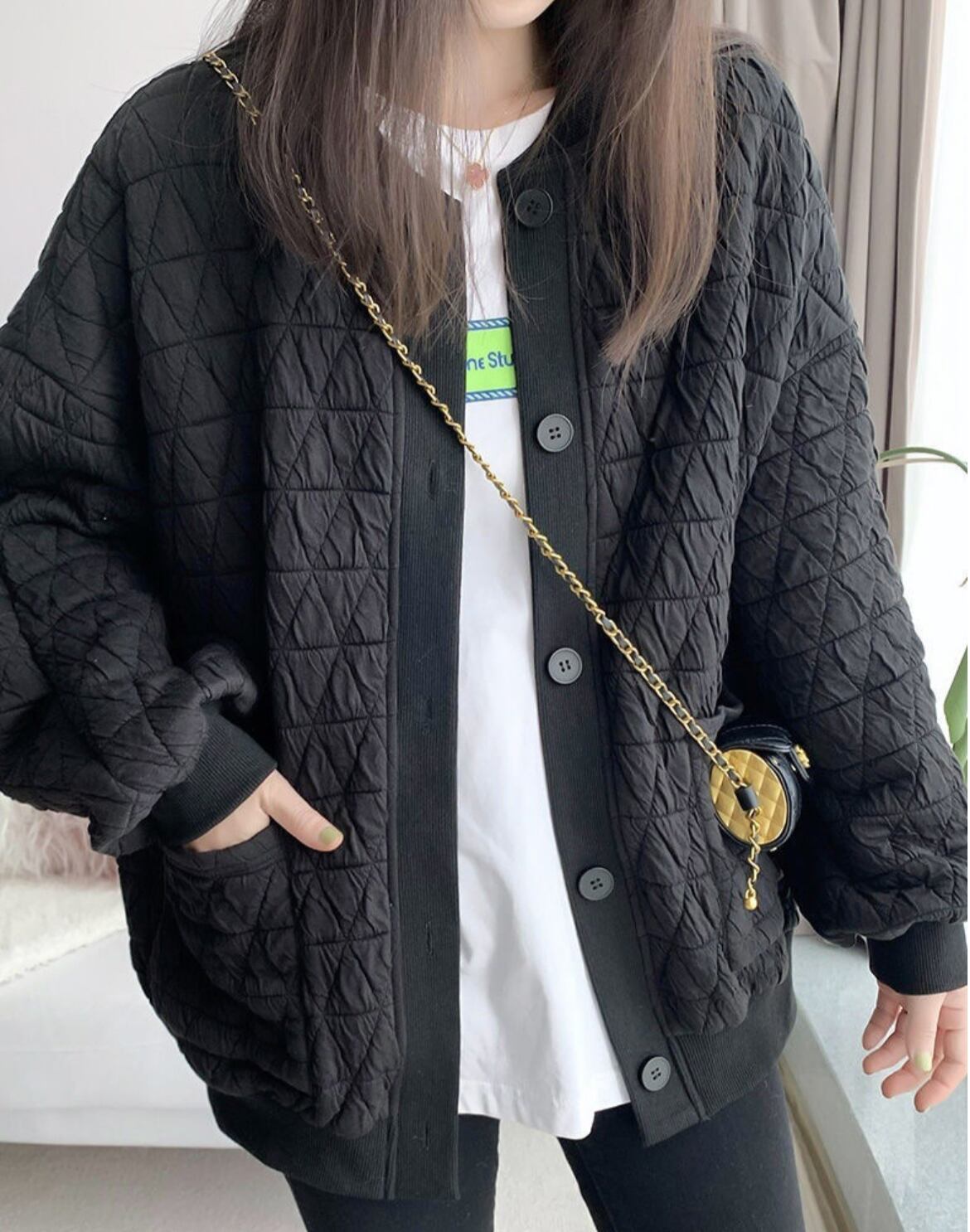 ジャケット ブルゾン アウター レディース 長袖 クルーネック 襟なし ドロップショルダー フェミニン ポケット 前開き ボタン 大人可愛い きれいめ シンプル カジュアル おしゃれ こなれ感 ラフ ルーズ 存在感 抜け感 アクティブ リラックス スタイリッシュ キルティング加工 秋 冬 オフィス OL 通勤 デート お出かけ イベント 女子会 休日 ショッピング カフェ ランチ 韓国 オルチャン 暖かい 体型カバー 普段使い 着回し トレンド スタイルアップ S M L XL ホワイト ブラック
