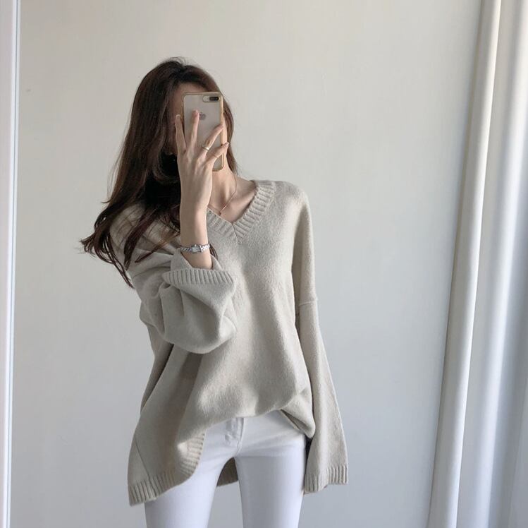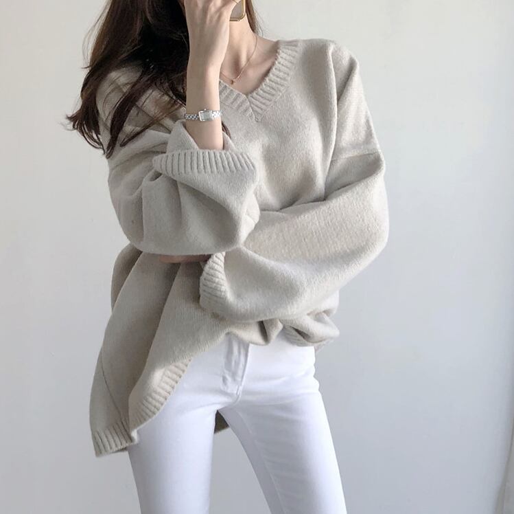 大人可愛いデザインのVネックニットセーターが登場です!長袖のワイドシルエットは、リラックス感を演出しながらも、上品さを兼ね備えたアイテムとなっています。