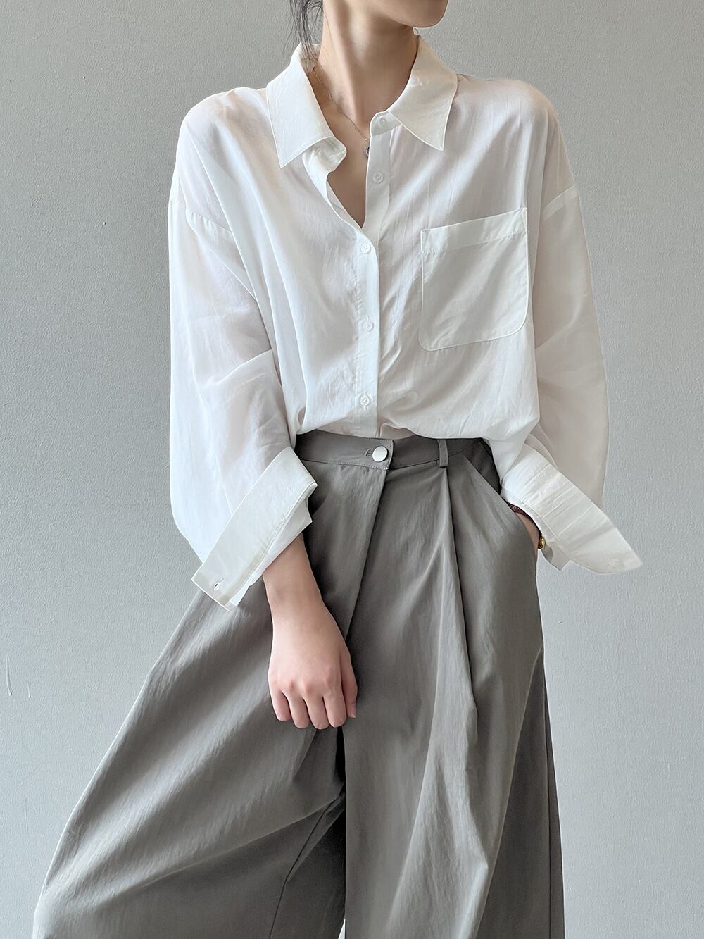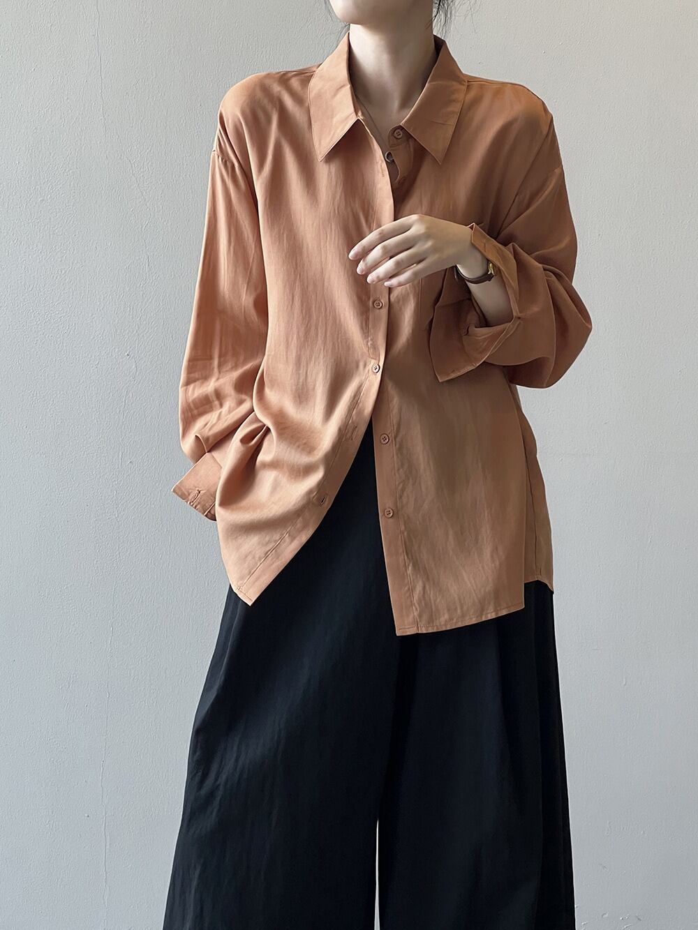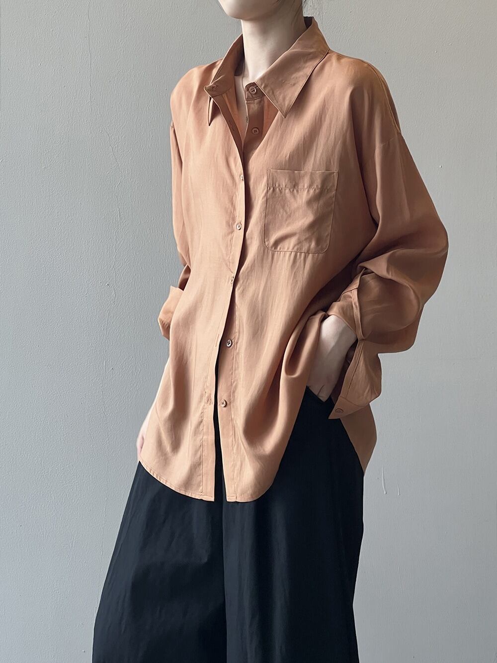 このシャツは、優雅な長袖デザインに襟付きの角襟を採用し、洗練された印象を与えます。
