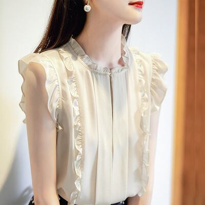 袖なしのフリル袖と透け感のあるシフォン素材が、清潔感と愛らしさを演出します。