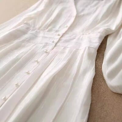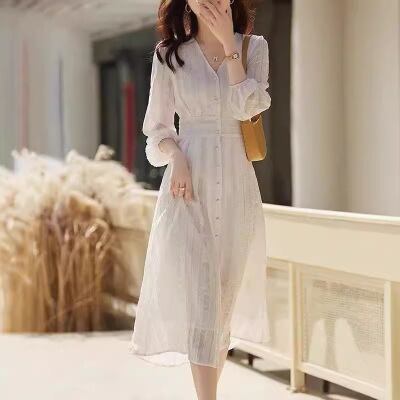 フェミニンな印象を纏う、レディースワンピースの登場です。フレアが美しいミモレ丈で、7分袖はボリューム感たっぷりのパフスリーブデザイン。VネックとセミフレアのAラインシルエットが、女性らしさを引き立てます。ウエストマークされたハイウエストの形は、スタイルをよく見せてくれ、また、透け感のあるヴィンテージ風の透かし模様が魅力的です。