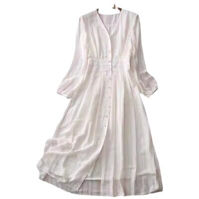 レディース ワンピース フレア ミモレ 7分袖 ボリューム袖 パフスリーブ Vネック セミフレア Aライン フェミニン ウエストマーク ハイウエスト 前開き 透け感 ヴィンテージ 透かし模様 ボタン 薄手 かわいい 大人可愛い きれいめ シンプル 上品 レトロ エレガント 主役級 抜け感 ラグジュアリー クラシカル カントリー ロマンティック ナチュラル 清潔感 涼しげ リラックス 軽やか 通気性 爽やか ストライプ 春 夏 秋 ロングシーズン オフィス ビジネス OL 通勤 デート お出かけ パーティー