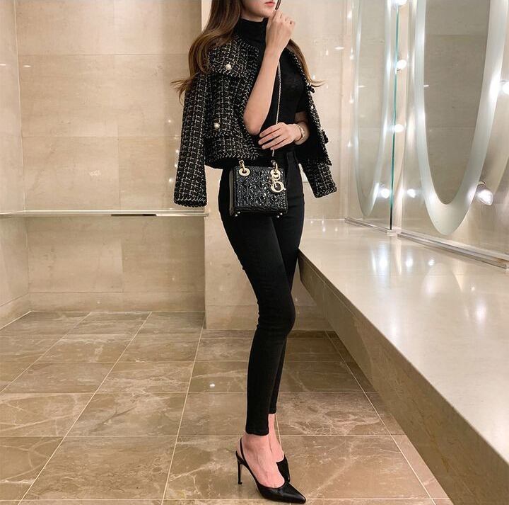 ノーカラーのラウンドネックとスリムなシルエットが、フェミニンでありながら都会的な雰囲気を醸し出し、存在感を引き立てます。