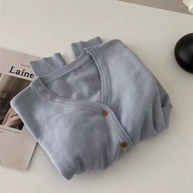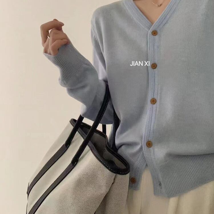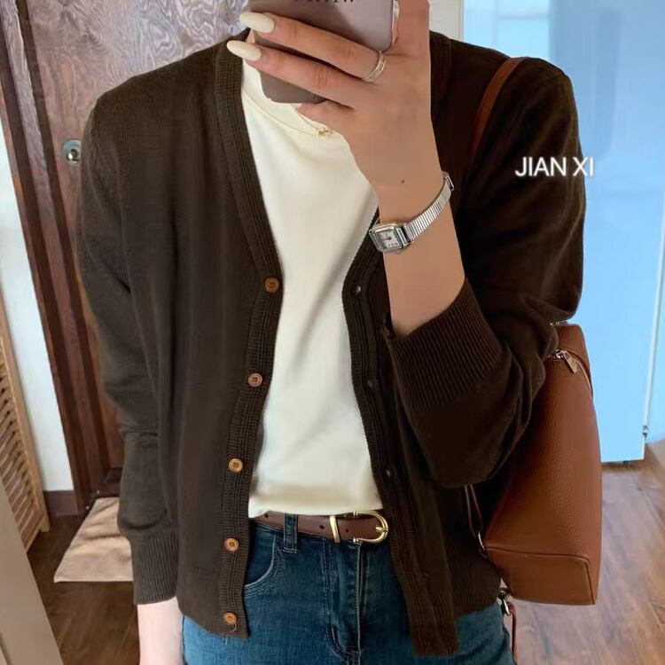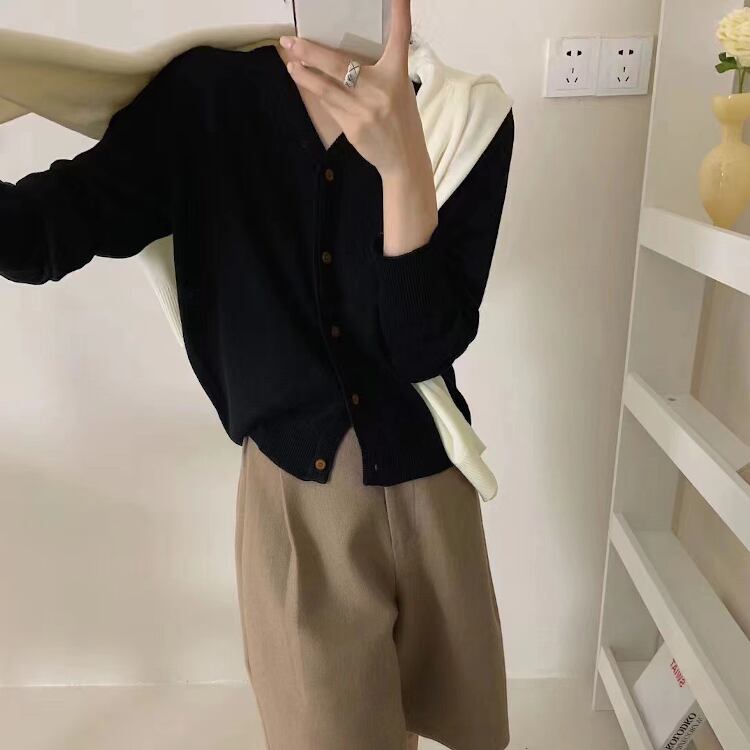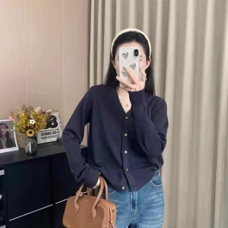 シンプルで着回しやすいVネックのニットカーディガンは、季節の変わり目にぴったりの一着。