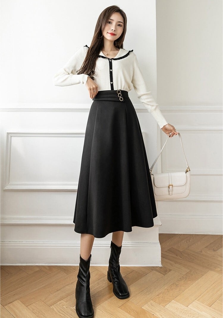 上品なフレアラインが美しく広がるミモレ丈スカート。