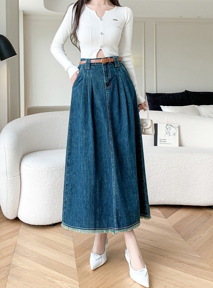 裾のカットオフデザインがこなれ感を引き立てるデニムロングスカート。程よく入ったタックが立体的なAラインシルエットを生み出し、カジュアルながらも女性らしい雰囲気を演出します。