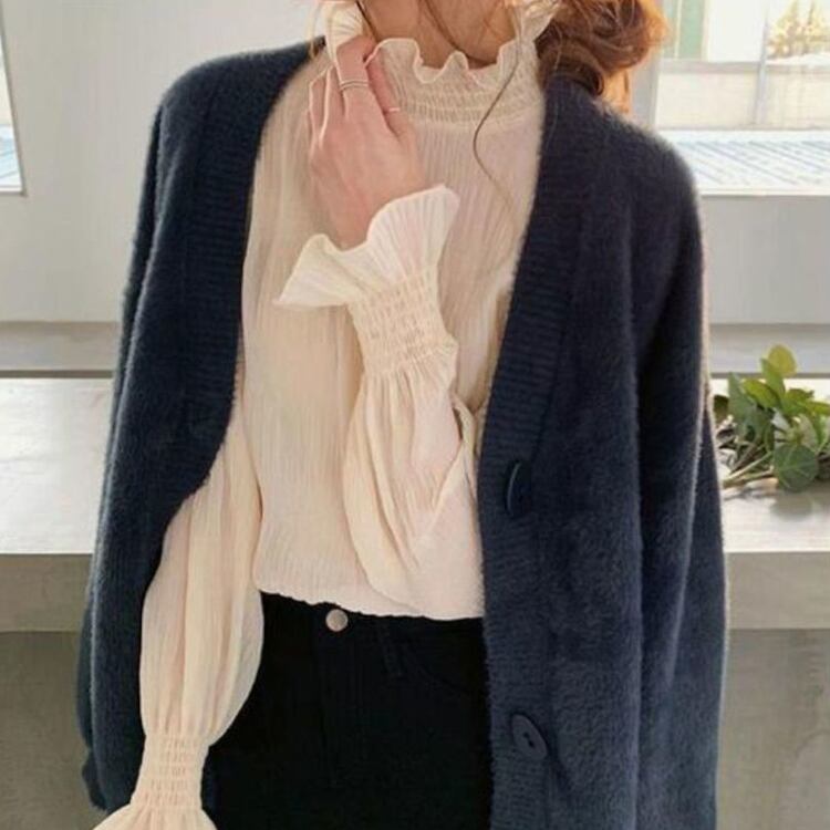 ふんわりボリューム袖とハイネックフリルが印象的な、大人可愛いブラウスです。