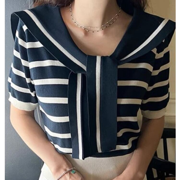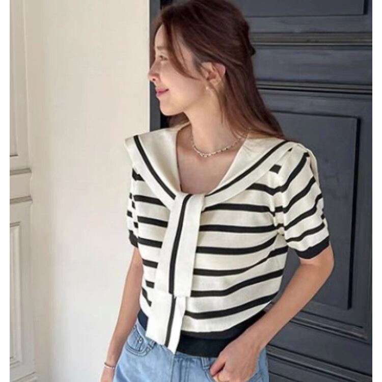 セーラーカラーとボウタイが愛らしい印象を与える、夏らしい半袖カットソーです。