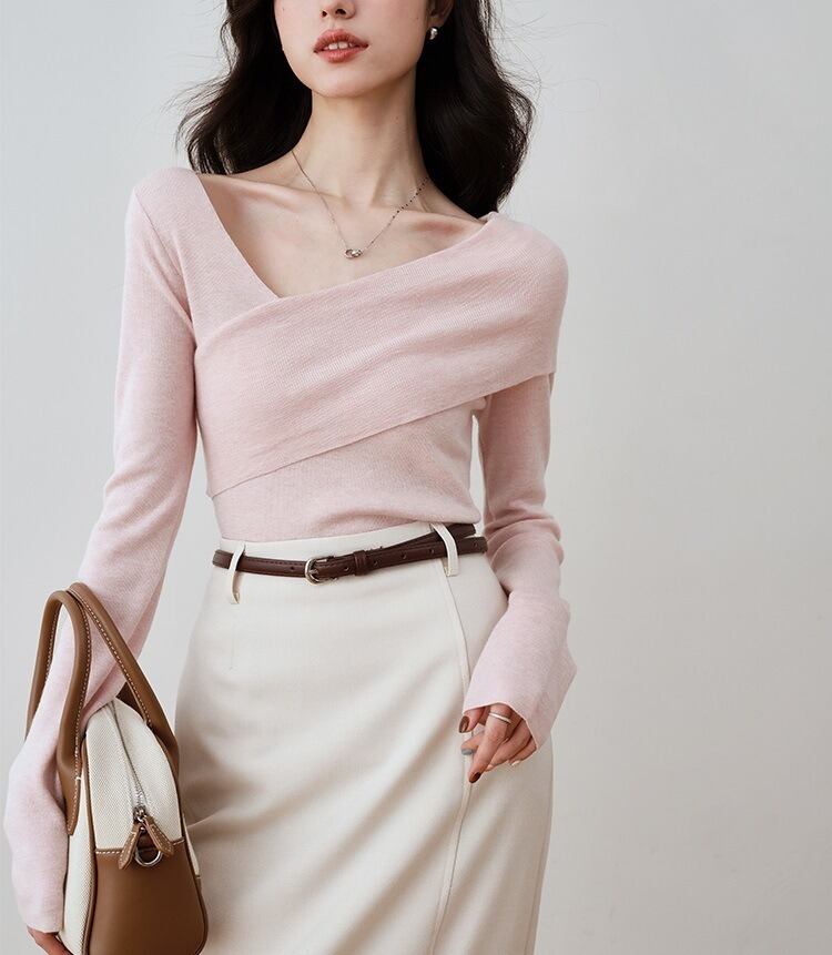 ニットソー レディース トップス カットソー プルオーバー 長袖 Vネック カシュクール 襟なし ノーカラー タイト スリム 細身 アシンメトリー スマート ストレッチ 伸縮性 シンプル カジュアル おしゃれ こなれ感 抜け感 セクシー 無地 春 秋 デート お出かけ イベント 旅行 公園 女子会 休日 ショッピング ライブ 合コン コンパ カフェ フェス コーデ 普段使い 着回し S M L ピンク パステル 春カラー