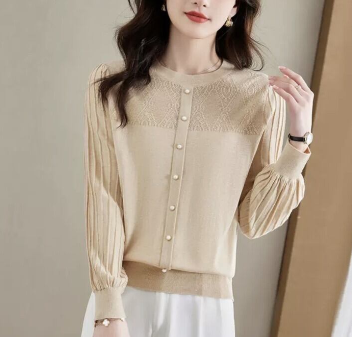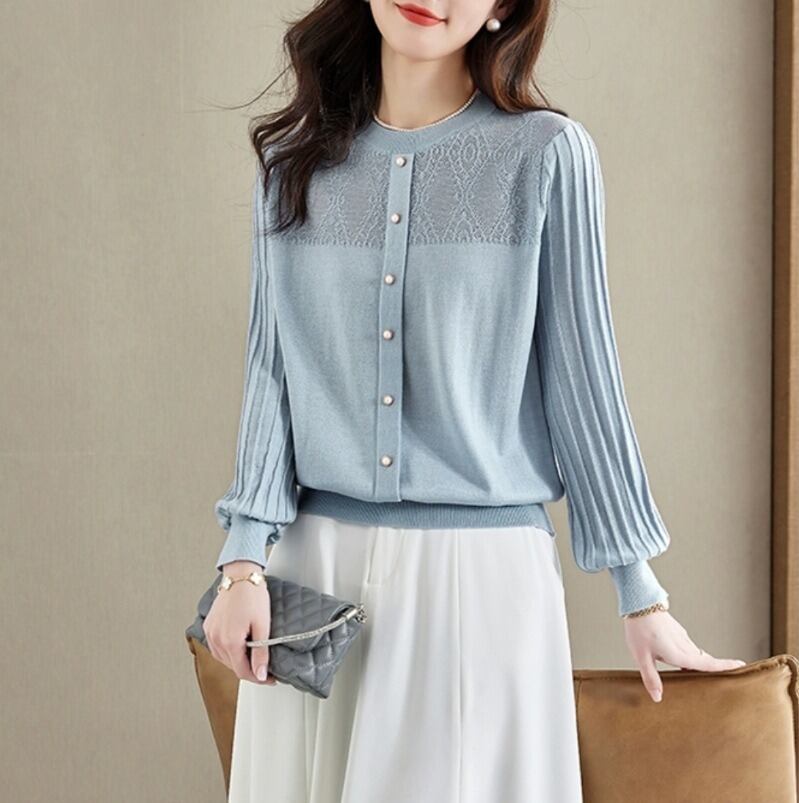 上品な佇まいが魅力の切り替えニットブラウス。並んだパール調ボタンが、女性らしい華やかさを引き立てます。袖のプリーツデザインが軽やかな動きを生み、どの角度からも美しいシルエットを演出します。