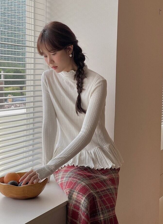 裾のフリルがふんわり広がり、女性らしい印象を与えるハイネックトップス。首元まできれいに包み込むデザインが上品さを引き立て、シンプルな中にも華やかな雰囲気を添えます。