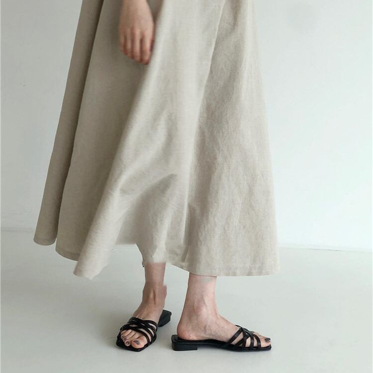ラウンドネックと襟なしデザインが首元をすっきり見せ、さらりとした生地感が夏の装いを爽やかに演出。