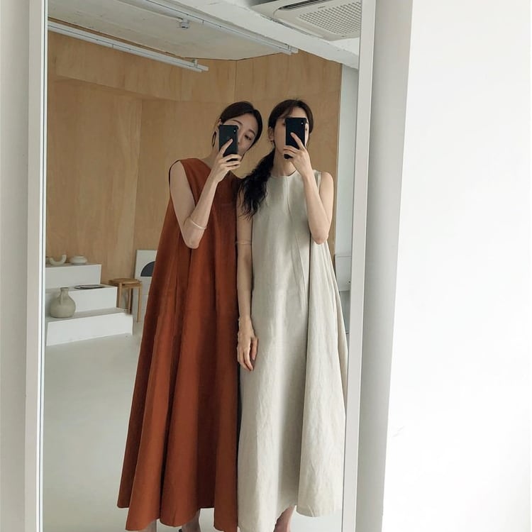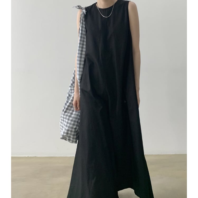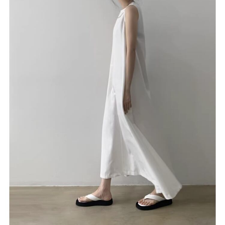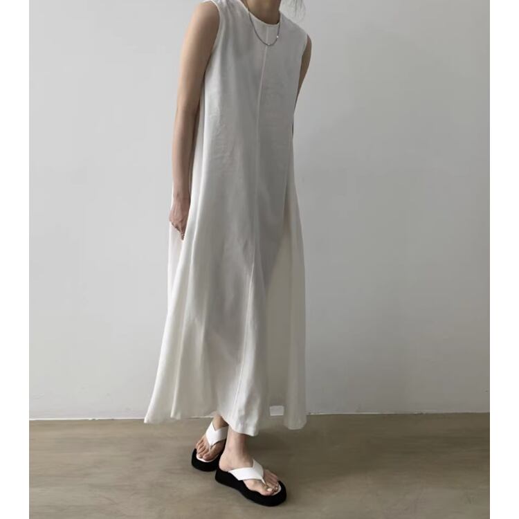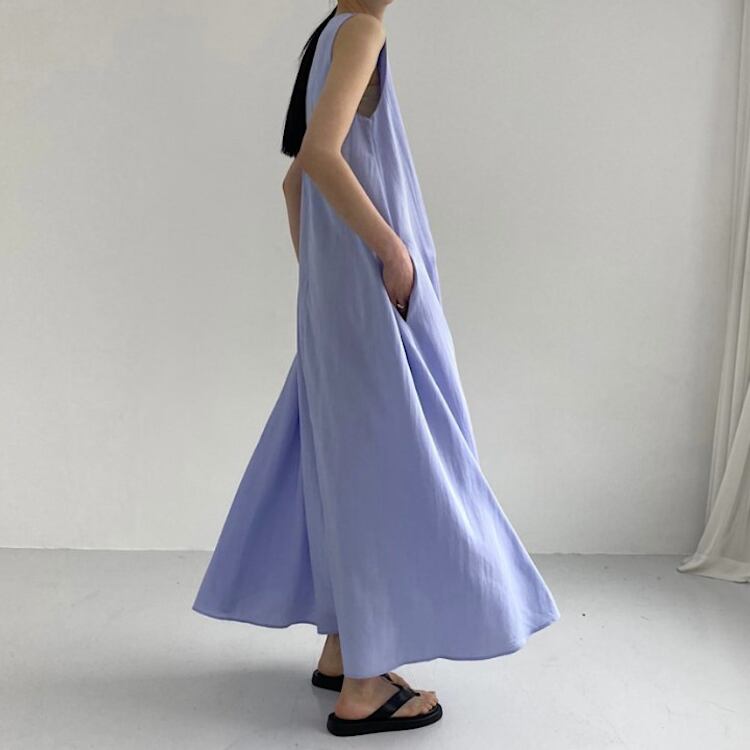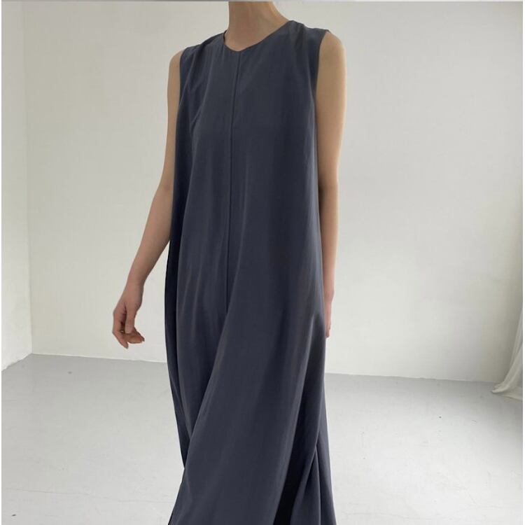 軽やかなドレープが美しい、Aラインシルエットのノースリーブロングワンピースです。