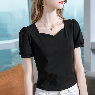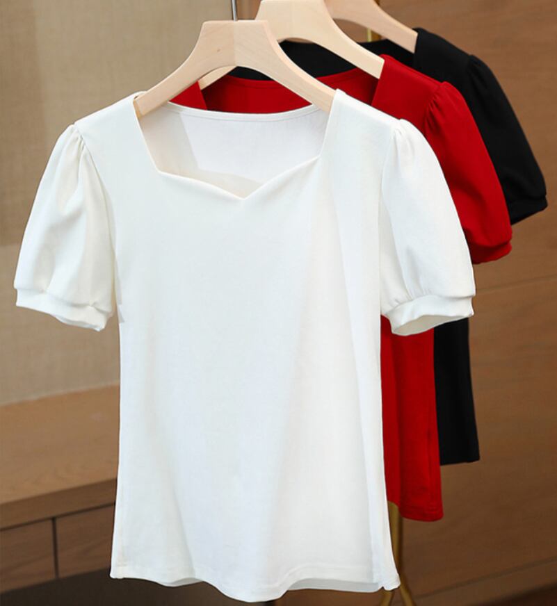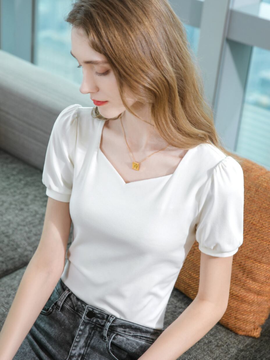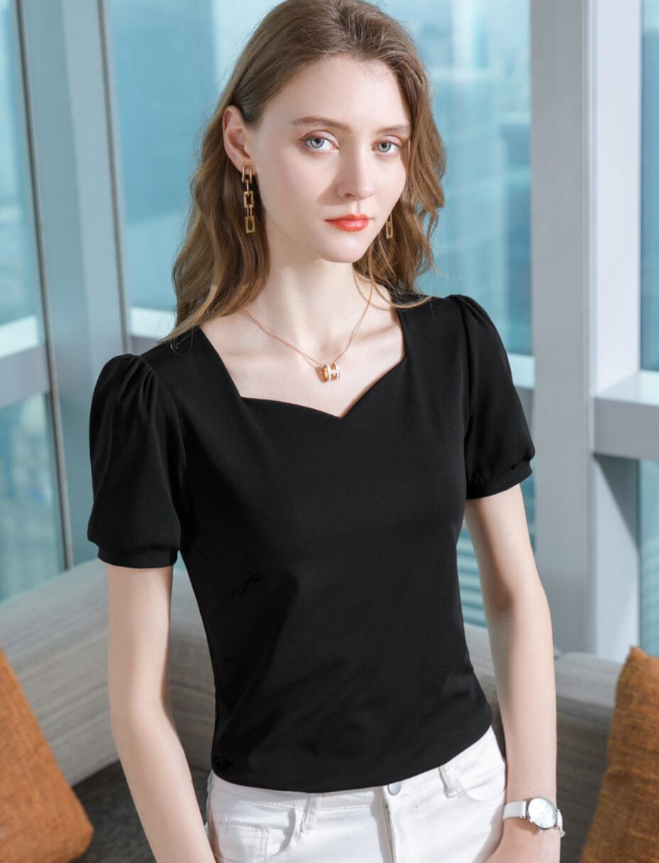 パフスリーブが華やかな印象を与え、スクエアネックが大人の女性の魅力を引き立てます。暑い夏に大活躍します。